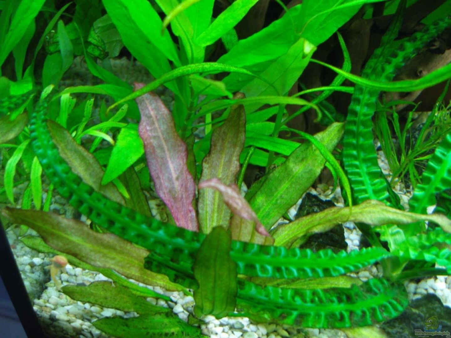 Echinidorus Red Diamond Crinum natans Vallisneria americana Ludwiga repens rubin im Hintergrund Kirschbäumchen mit schmalen und breiten Blättern Bolbitis heudelotii Ceratophyllum demersum Foxtail als frei schwimmende Planze Gymnocoronis spilanthoides Täglich Easy Carbo und Elos Fase1 Flüssigdünger