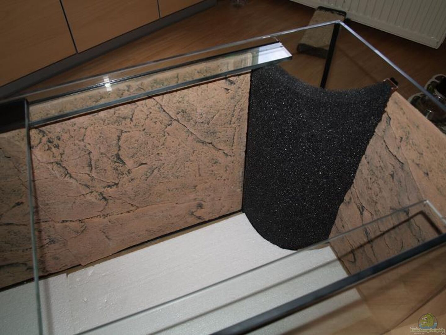 Als Rück- & rechte Seitenwand wurde Back To Nature Slim Line Module in rotem Gneis eingeklebt. Bruchsteinplatten aus dem Naturstein-Gro??handel aufeinander gestapelt als Felsformation. Habe versucht die HMF so gut wie möglich hinter den Steinen zu verstecken. Des weiteren Steine/Felsen angeordnet als Geröllhaufen aus der näheren Umgebung.