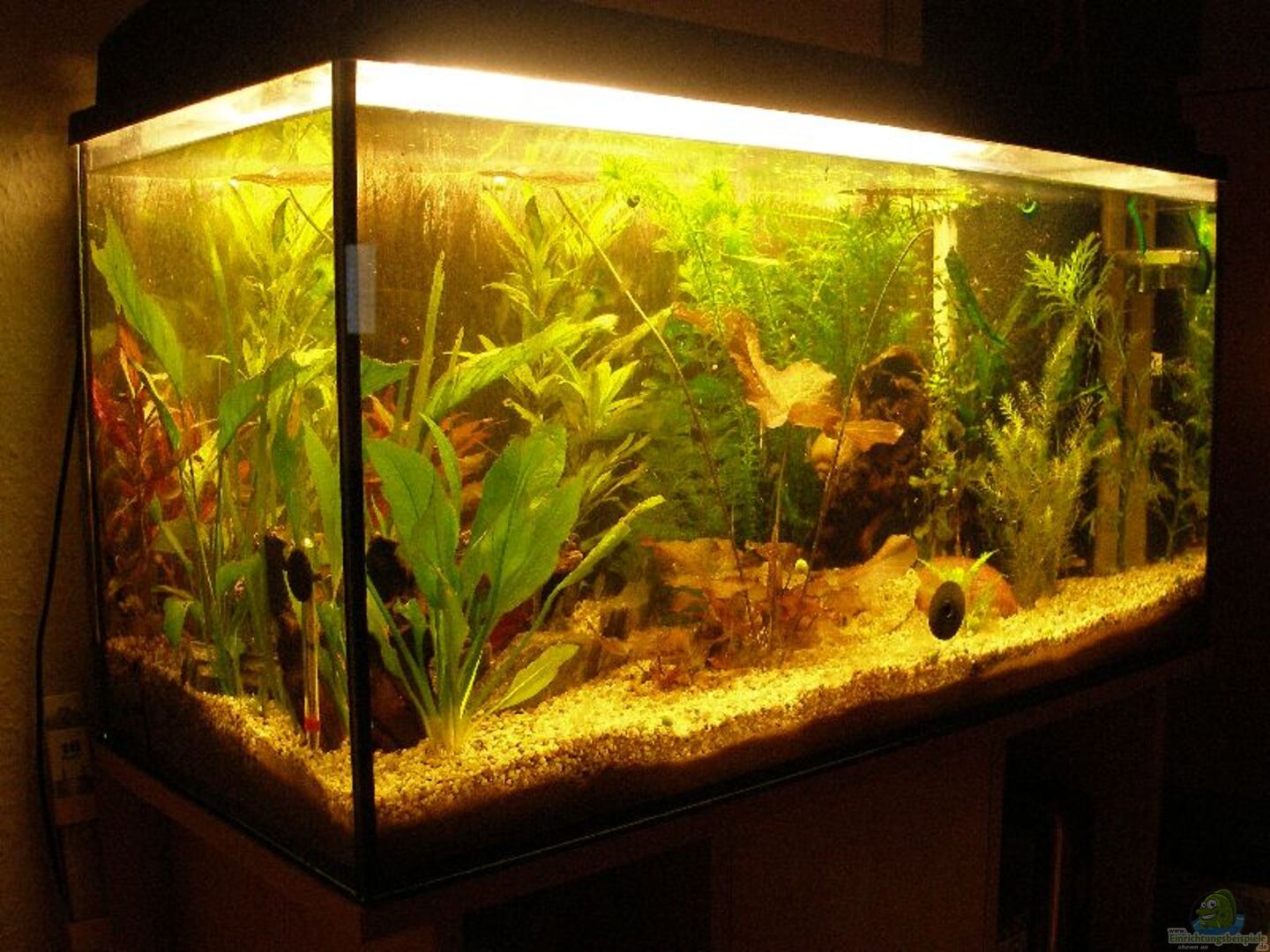 ehemals Starterset von MP, bei dem nun in einem neuen Glasbecken ein komplett neuer Ansatz gemacht wird, um die Reste der Mooskugeln los zu werden. Gleichzeitig steige ich von Au??enfilter auf Mattenfilter um. Unterschrank Buche hell von MP (ersetzt alten IKEA-Schrank)