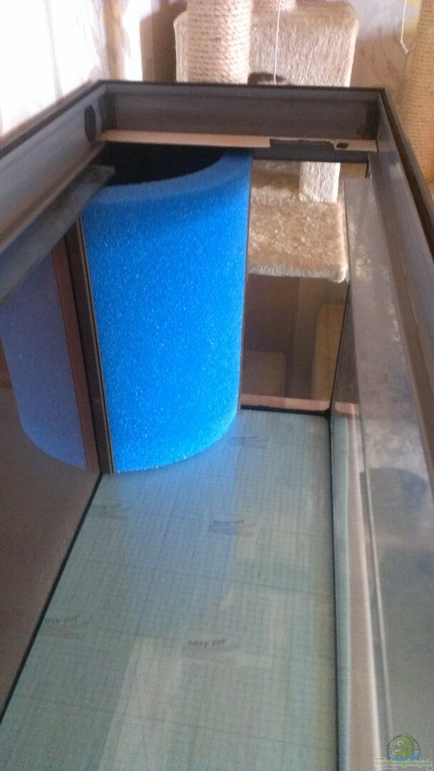 Links und Rechts sind unter den Querstreben Abdeckung vom Kabelkanal angeklebt. Der befindet sich auf Wasserspiegelhöhe und hält somit die Schwimmpflanzen in der linken und rechten Ecke. Schön für meine Fadenfische.