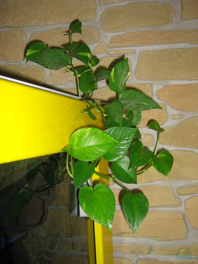 Inzwischen reichlich Cryptocoryne aponogetifolia. Als Nitratverbraucher sind links und rechts Efeututen - Ableger ins Becken eingehängt. Sie sollen irgendwann mal die Rückwand hinter dem Becken beranken.