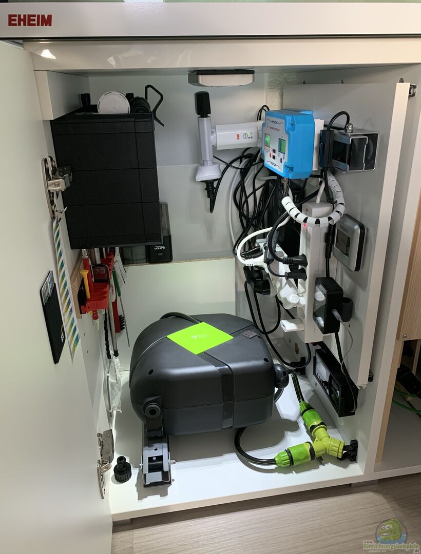 ??? Technik Station - ausfahrbar: - EHEIM Professionel 4+ 350T / Aussenfilter mit integrierter Heizung - CO2-Flasche mit Druckreduzierventil / CO2 Reactor 4l - 2 Magnetventile sorgen für eine kontrollierte Dosierung - EHEIM Air 200 / Sauerstoffpumpe - JBL Proflora Direct Diffusor CO2 ??? Panel für elektrische Komponenten - ausfahrbar: - ph/Temp./EC Control - Temp.Anzeige um einströmendes Wasser nach der Schlauchrolle zu kontrollieren - JUWEL HeliaLux Day + Night Control - [...]