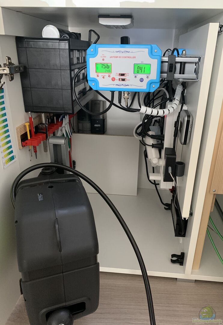??? Technik Station - ausfahrbar: - EHEIM Professionel 4+ 350T / Aussenfilter mit integrierter Heizung - CO2-Flasche mit Druckreduzierventil / CO2 Reactor 4l - 2 Magnetventile sorgen für eine kontrollierte Dosierung - EHEIM Air 200 / Sauerstoffpumpe - JBL Proflora Direct Diffusor CO2 ??? Panel für elektrische Komponenten - ausfahrbar: - ph/Temp./EC Control - Temp.Anzeige um einströmendes Wasser nach der Schlauchrolle zu kontrollieren - JUWEL HeliaLux Day + Night Control - [...]