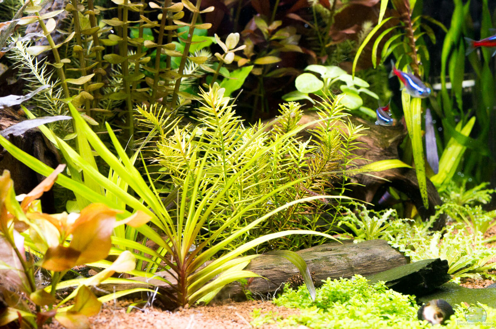 Die Rückwand Juwel STR 600 wurde auf zwei Seiten (über Eck) eingeklebt. Die Dekoration besteht hauptsächlcih aus fünf Moorkienwurzeln und zwei Mangrovenwurzeln. Die Wurzeln wurden zu einem gro??en Gebilde zusammengesetzt und bilden dadurch viele Hohlräume. Die Wurzeln wurden zusätzlich mit Anubias bepflanzt. Die Positionierung erfolgte in der hinteren Ecke. Dadurch wurde die nach hinten ansteigende Optik unterstützt. Zusätzlich findet sich noch etwas loser Schieferbruch im Vordergrund. Im [...]