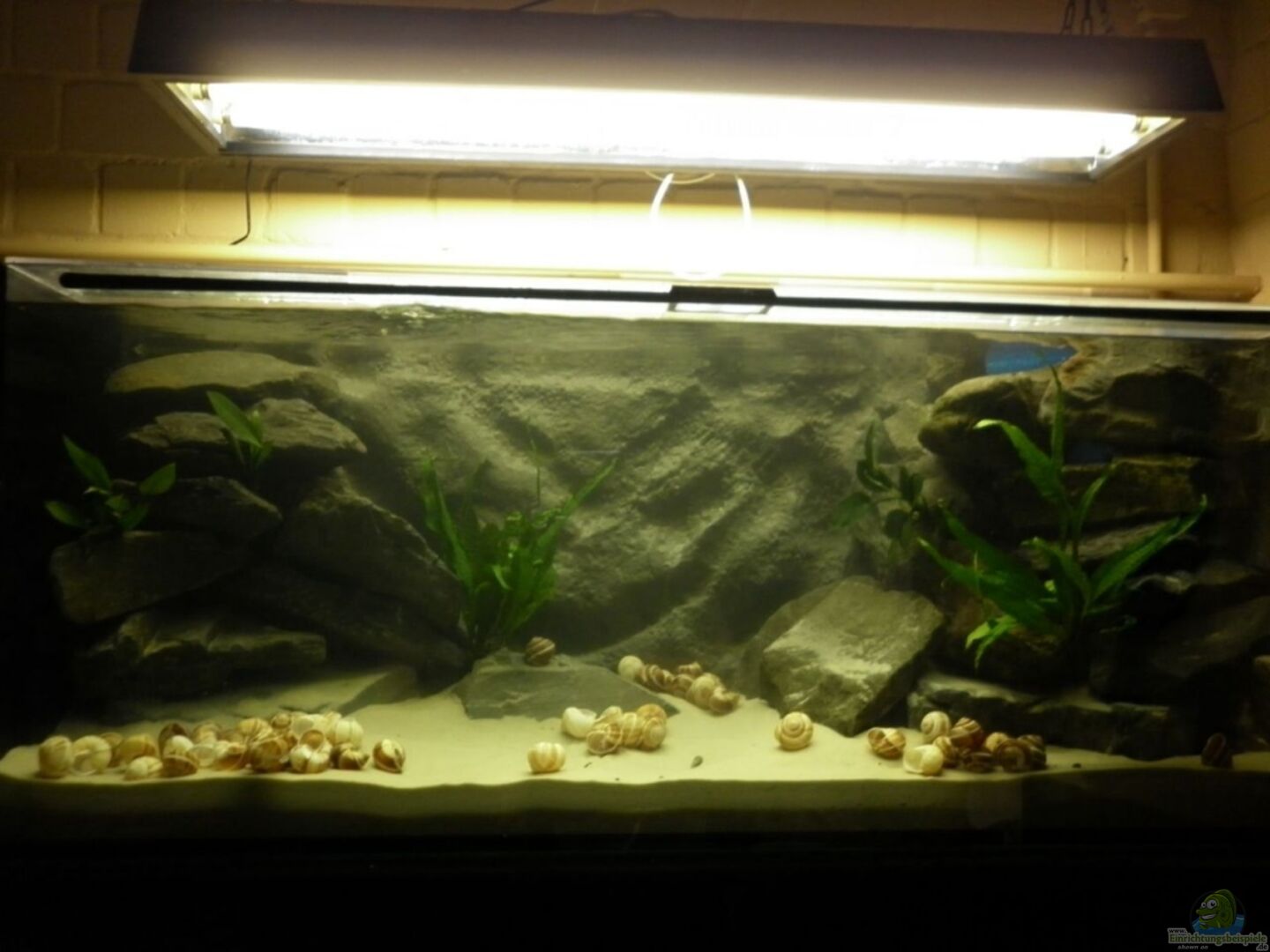 Rückwand: Eigenbau, genaueres bei Tanganjika ??bergangszone Steine: ca.100Kg ``graue Wacke`` von der Schurenbachhalde in Altenessen (graue Wacke nennt die mein Opa der die seiner zeit aus der zechengrube geholt hat) Sonstiges: Weinbergschneckenhäuser, für den Anfang ca. 30-50. Ich werde noch einige nachlegen müssen, wenn die Callipterus sich die gegenseitig klauen.