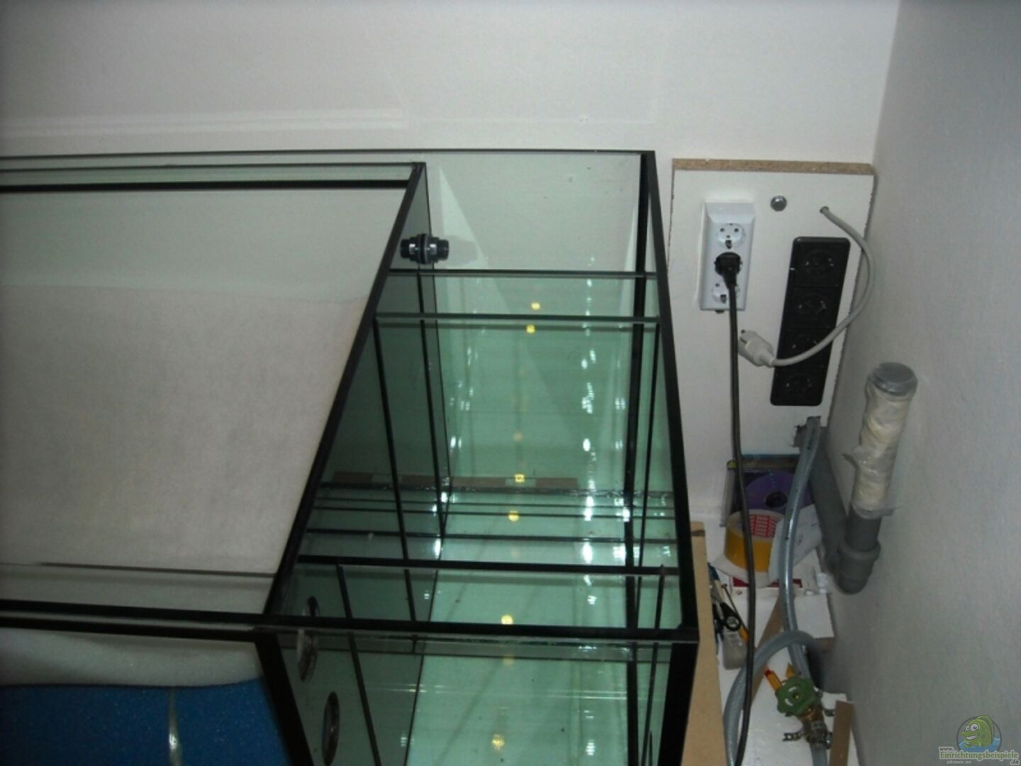 Das Aquarium wurde aus 12mm Floatglas gefertigt, auf Sto?? verklebt und mit einer Sicherheitsnaht versehen. Es verfügt über einen Mittelsteg, Längsstreben unten und oben und einer eingauten Filterkammer mit 4 Kammern. ***** Das Becken kommt von Megazoo. ***** Der Unterbau wurde aus 10x10cm Staffeln vom Baumarkt gefertigt und in eine Estrichausgleichsmasse gelegt um eine idelae Verbindung zu den vorhandenen Bodenfliesen zu ermöglichen. Weiters wurden die Staffeln mit 24 cm langen sechskant [...]