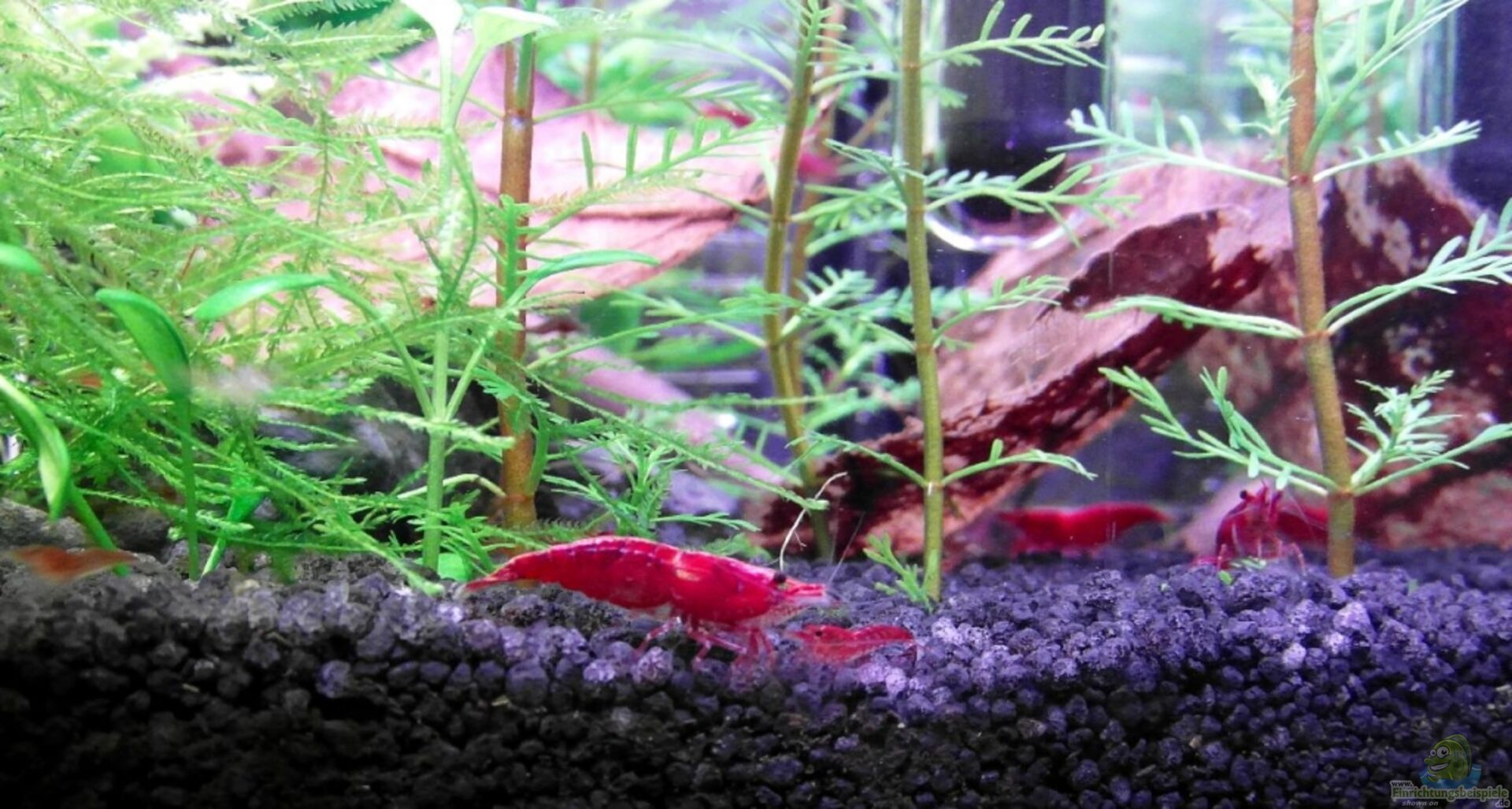 12-14 gro??e Sakura Garnelen mittlerweile etliche Jungtiere drei Geweihschnecken beim Kauf des Besatzes waren auch drei mini Jungtiere im Beutel, die natürlich mit ins Becken kamen. Sie entpuppten sich aber als zwei rote Tigergarnelen und eine schwarze Bienengarnele.