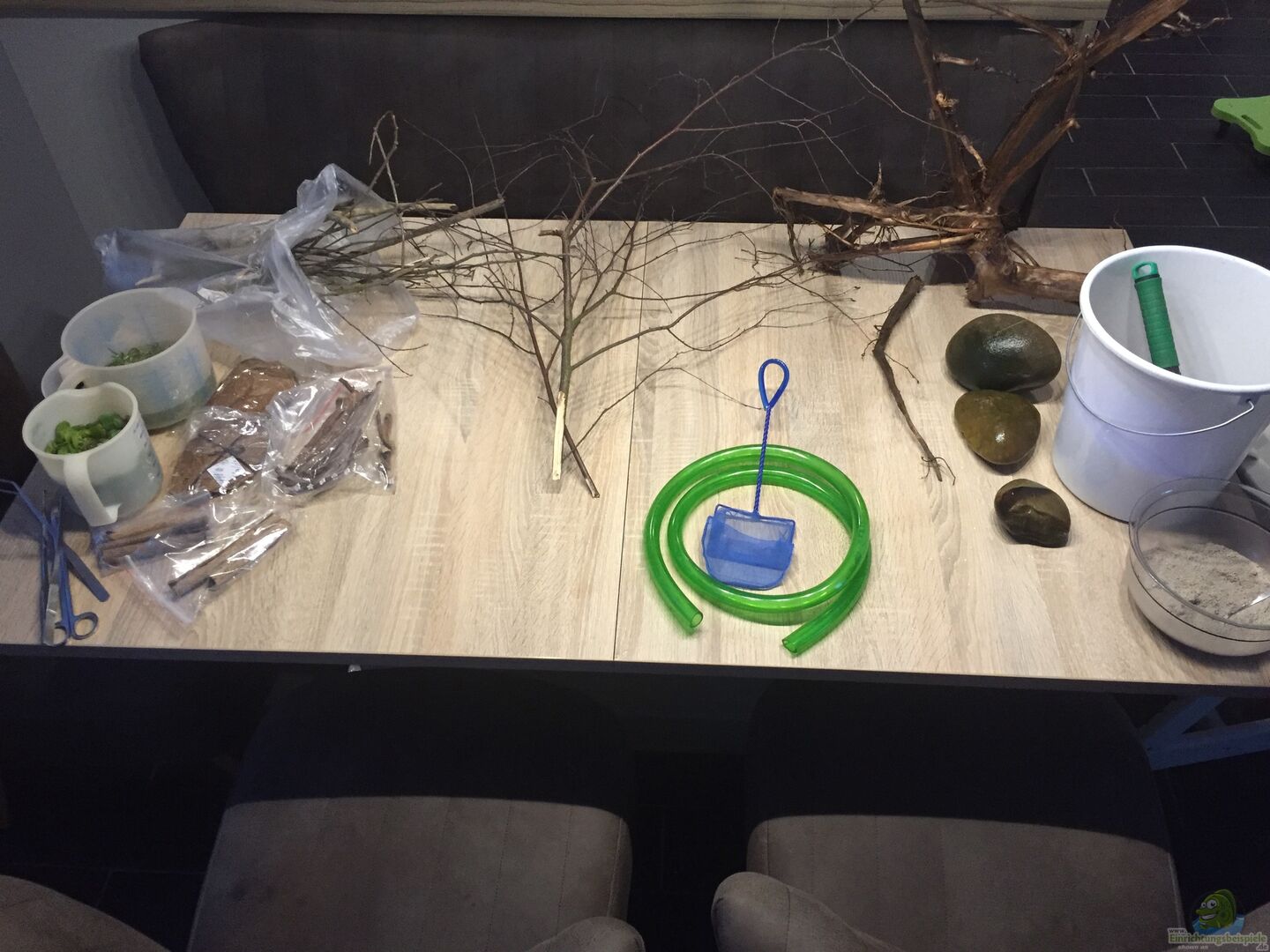 Leider wurde ich in unserer örtlichere Zoohandlung wegen einer gro??en Moorkienwurzel nicht fündig und musste deshalb eine im Internet bestellen. Einen grö??eren arm musste ich dann doch noch von der Wurzel abschneiden. Für die Flussholzoptike bin ich an einen Fluss in der Nähe gefahren. Dort konnte ich ein paar Birkenäste, Eichenäste, Totholz sowie ein wenig extra Laub sammeln. Für den Schwarzwassereffekt habe ich mir im Internet zusätzlich noch Seemandelbaumblätter in verschiedenen [...]