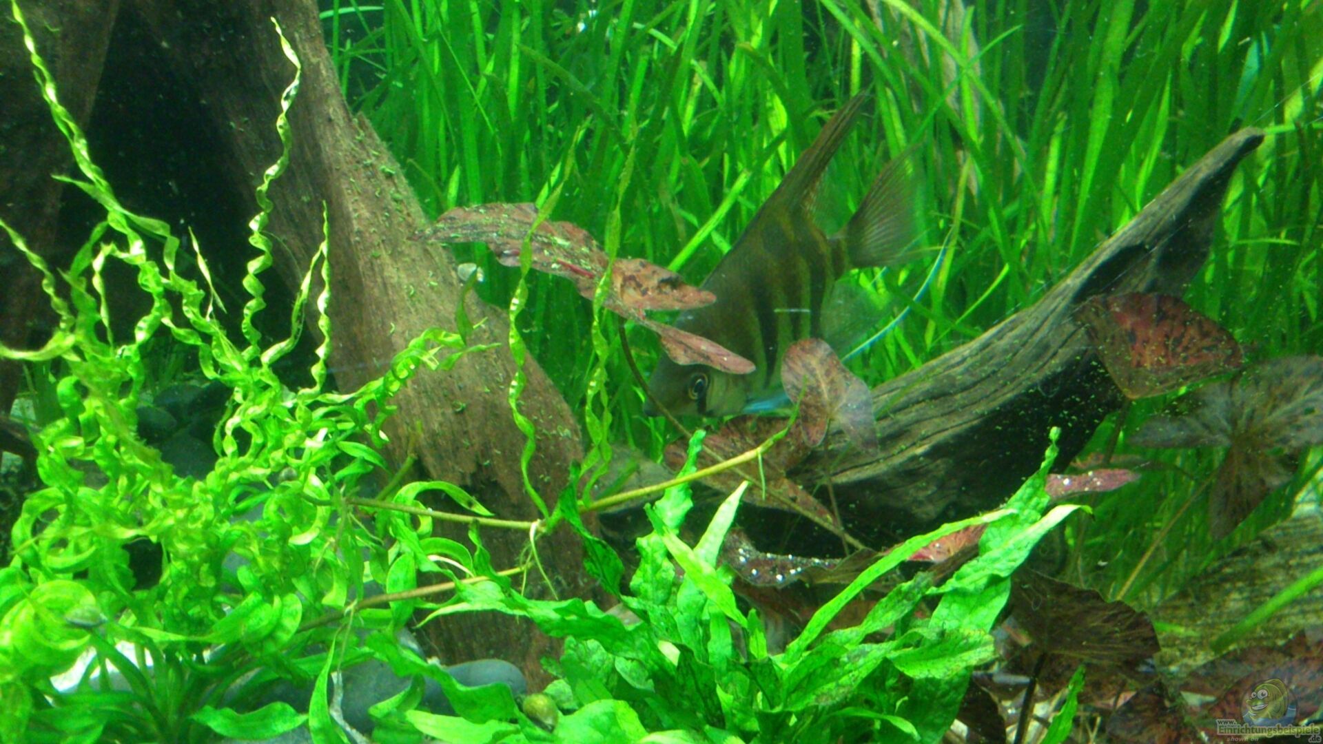 Des weiteren habe ich in dem Becken als Dekoration: - ca. 50-60 dunkelgraue Kieselsteine - Gro??e Moorkinwurzel - Mittlere Mangrovenwurzel - Mittlere Moorkinwurzel - Kleinere Moorkinwurzel - ein Lavastein - zwei Schieferplatten - dienen als Höhle - Mehrere dekorative Steine, alle aus einem Fachhandel, aus der Aquaristik-Abteilung - Seemandelbaumblätter (Catappa XL, JBL)