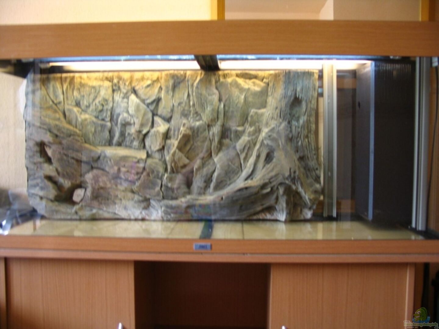 55 Kg Gestein; kalkhaltig, Sandgestein; Die Steine wurden so angeordnet, dass 6 getrennte Höhlen entstanden sind. 3 Höhlen haben mindestens 2 Eingänge. Zudem wurde noch eine ´Schwimm- und Fütterungszone´ eingerichtet. Die Steine wurden gründlich gewaschen und im Backofen mehrere Stunden ´durchgebacken´. Die Steine liegen auf 2 cm festem Styropurplatten. Und sie wurden untereinander mit Aquariumsilikon verklebt (Ist zwar sicher, aber Fische fangen wird dadurch zur reinen Nervenprobe). ACHTUNG! [...]