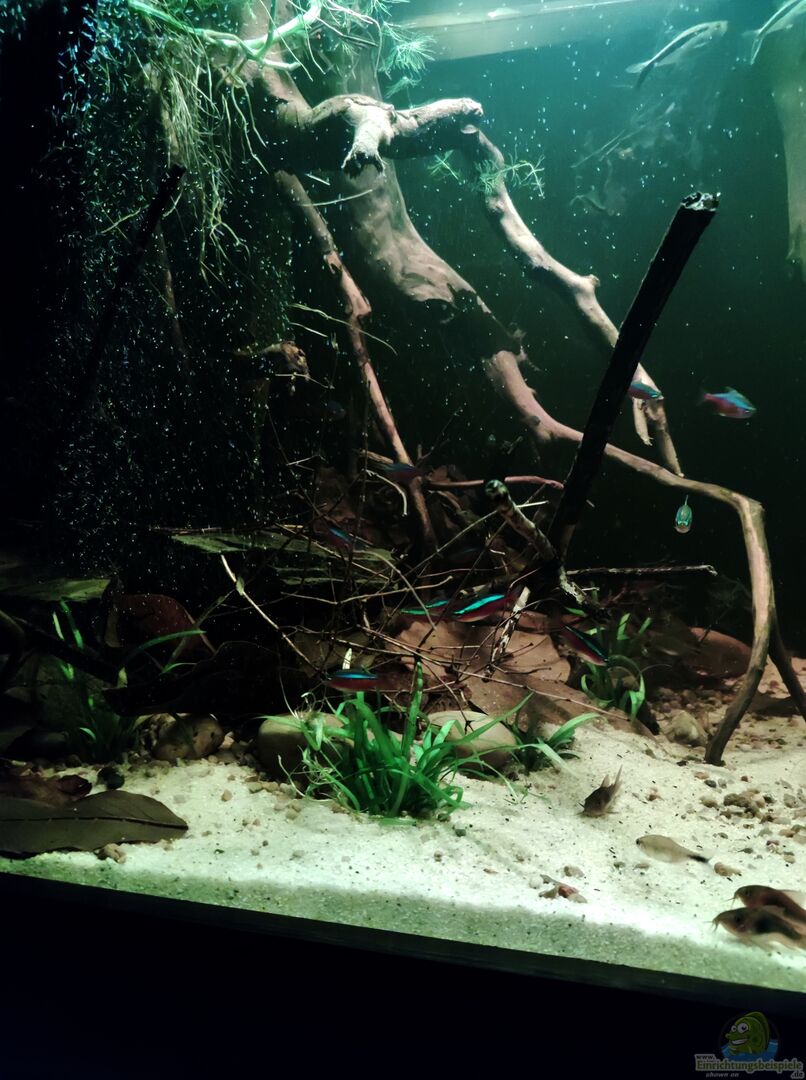 Dieses Becken soll ein kleiner Ausschnitt aus einem Nebenarm des Rio Negros (Uferbereich) darstellen. Ich habe versucht, dies so naturgetreu wie möglich nachzuarmen. Die Grundidee hinter der Aquariumeinrichtung war ein kleiner Nebenfluss am Ufer nachzustellen. Um diese Optik in meinem Aquarium zu kreieren, wurde besonders auf die Echtheit der Natur geachtet. Dafür bieten die zwei Wurzeln, die in das Aquarium ragen, einen zusätzlichen Schutz für die Fische während sie sich im Uferbereich aufhalten. [...]