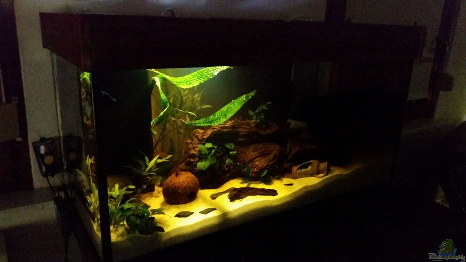 Ganz normales Aquarium. Aquarium kann durch 2 Plexiglasscheiben von oben eingesehen werden.