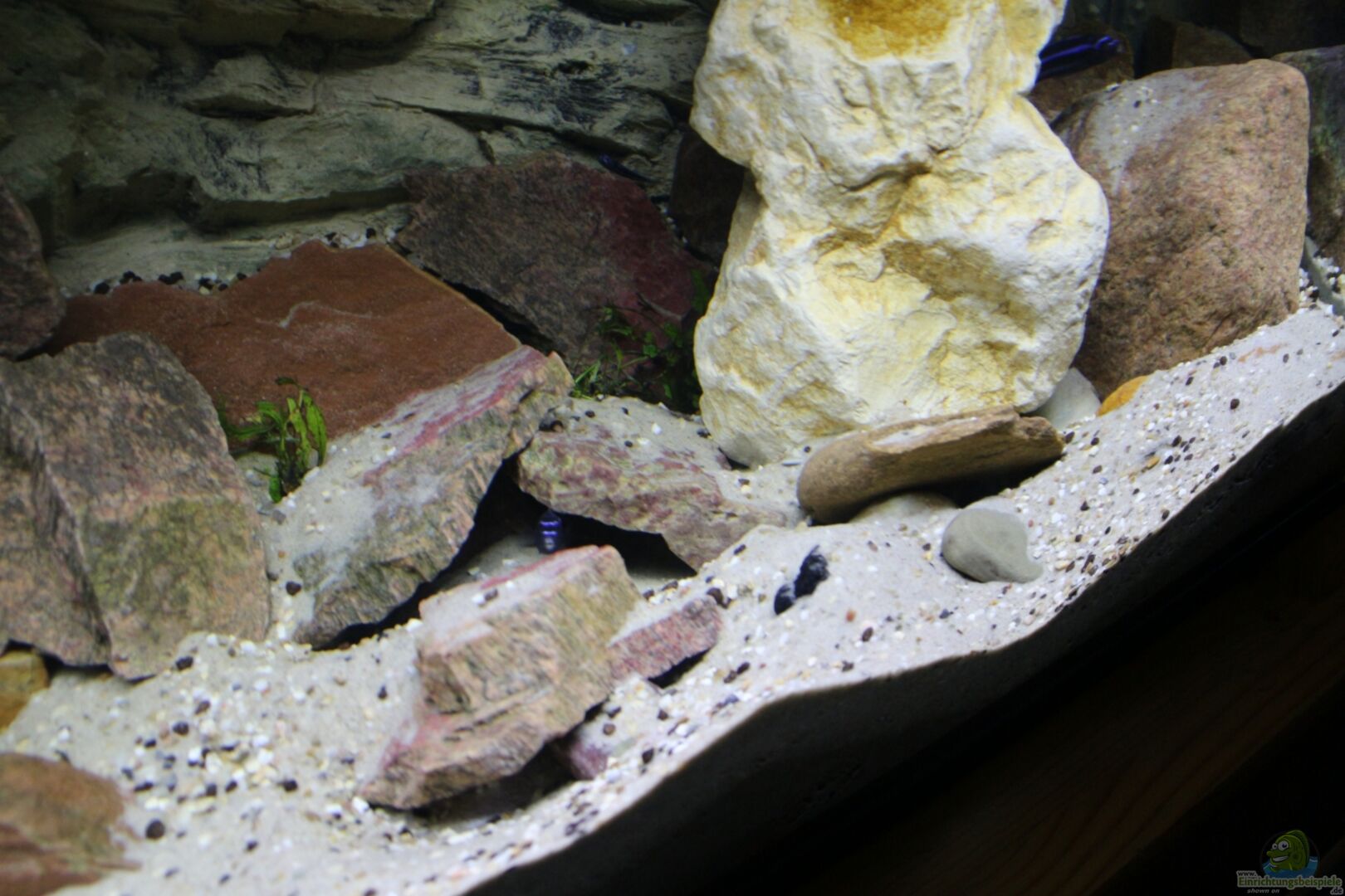 Rückwand, preiswert im Netz gefunden sowie Steine aus meinem alten Aquarium vor 15 Jahren. Da das neue Becken 10cm höher ist, habe ich mit Filterschaumstoff unterfüttert und den blauen 10cm Streifen unter der Rückwand mit Steinen verdeckt.