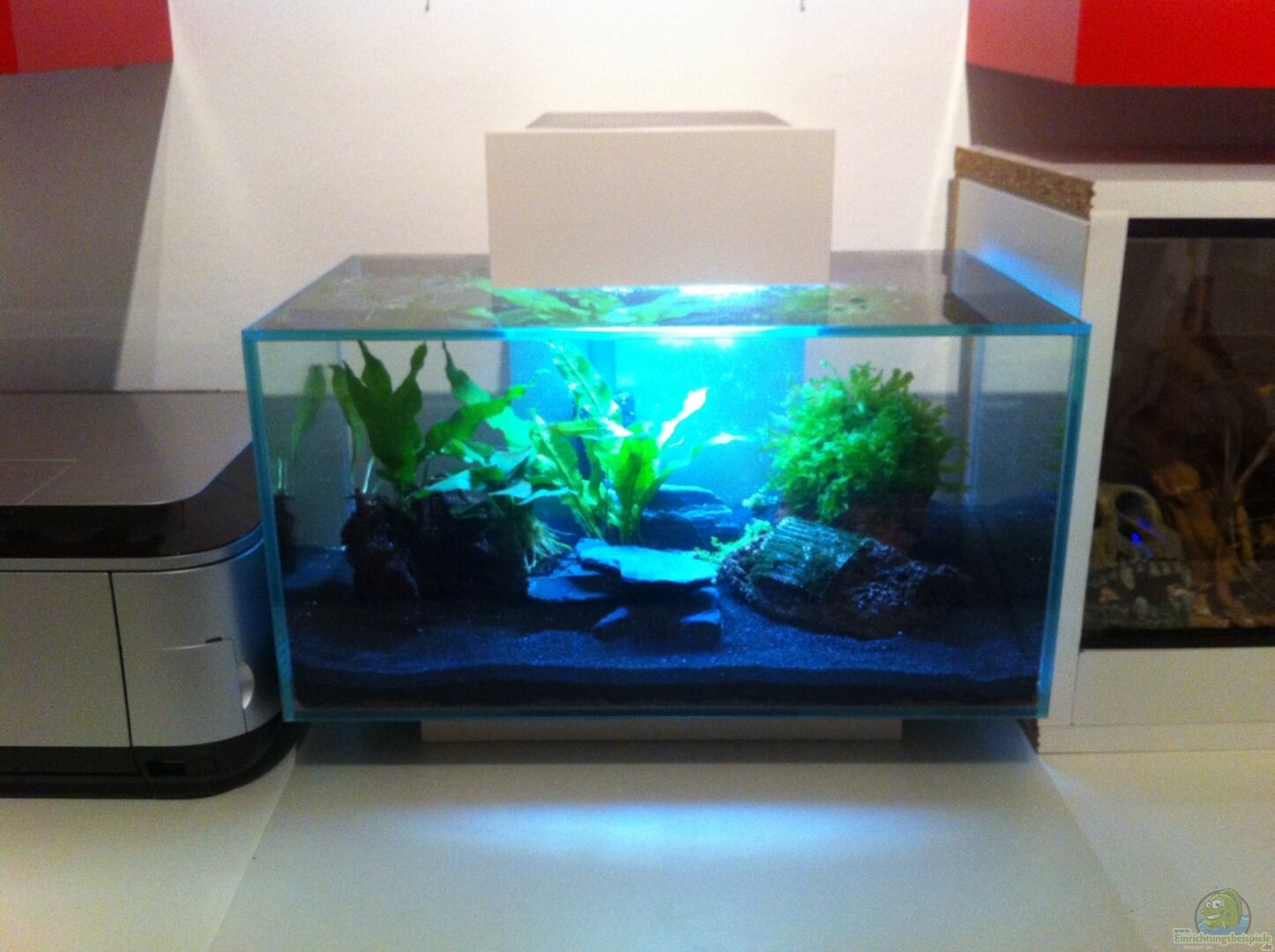 Bei dem Becken handelt es sich das sogenannte "Neue Fluval Edge". In der Abdeckung befindet sich im Gegensatz zu den Vorgängermodellen eine LED-Beleuchtung. ??ber die Einrichtung habe ich mir lange Gedanken gemacht. Zum einen sollte die Bepflanzung zum recht schwachen Licht passen, andererseits wollte ich aber gerne auch etwas lichthungrigere Pflanzen haben, deshalb habe ich mir zusätzlich zur normalen Beleuchtung eine recht simple Konstruktion mit einem LED-Streifen gebaut.