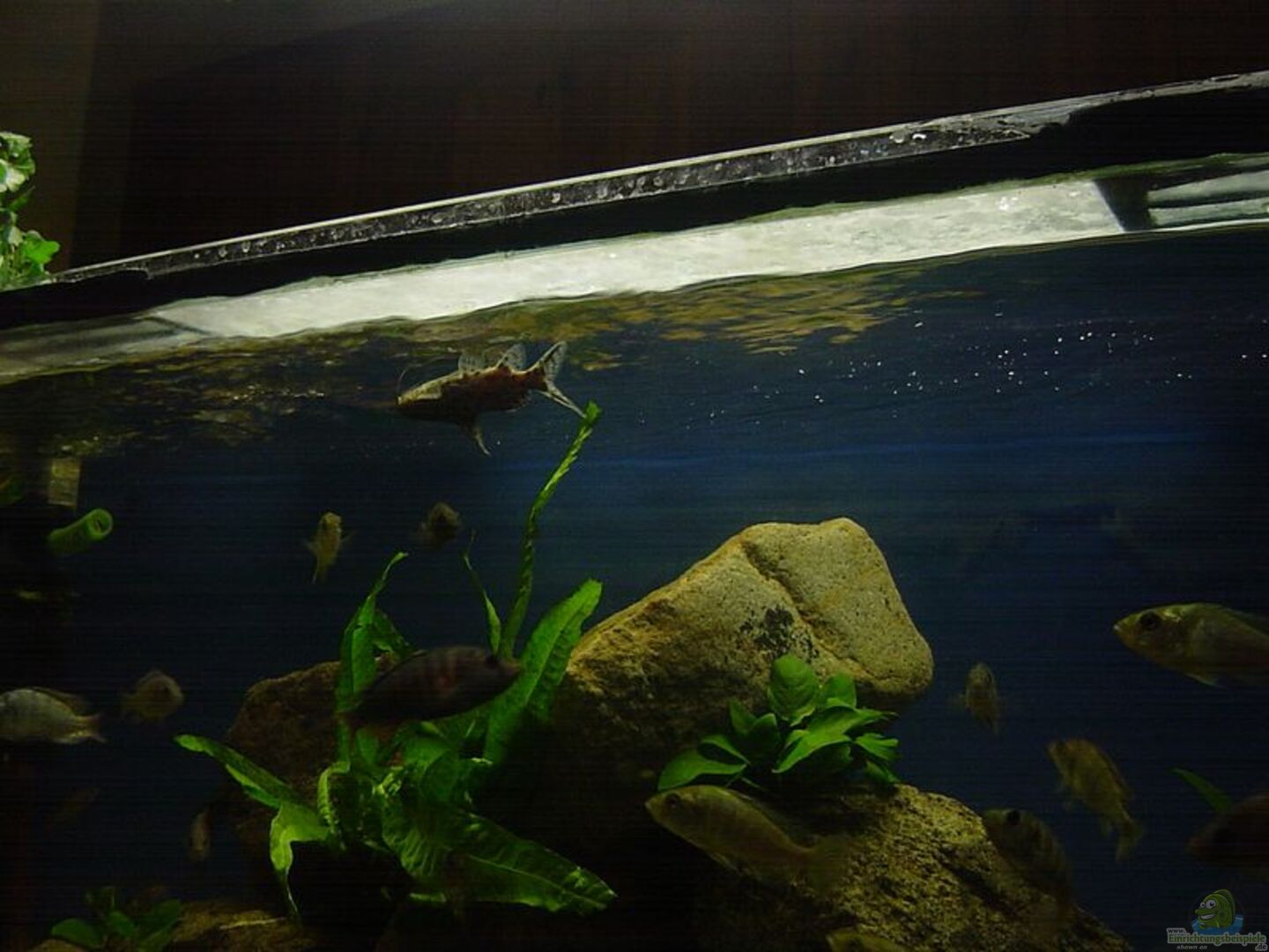 Insgesamt circa 25 Tiere Folgende Arten bewohnen das Becken -Pundamilla nyererei ´Crimson Tide´ -Haplochromis Thick Skin -Ptyochromis sp. Red Rock Sheller -Lithochromis Rupinnis- - Synodontis Multipunktatus