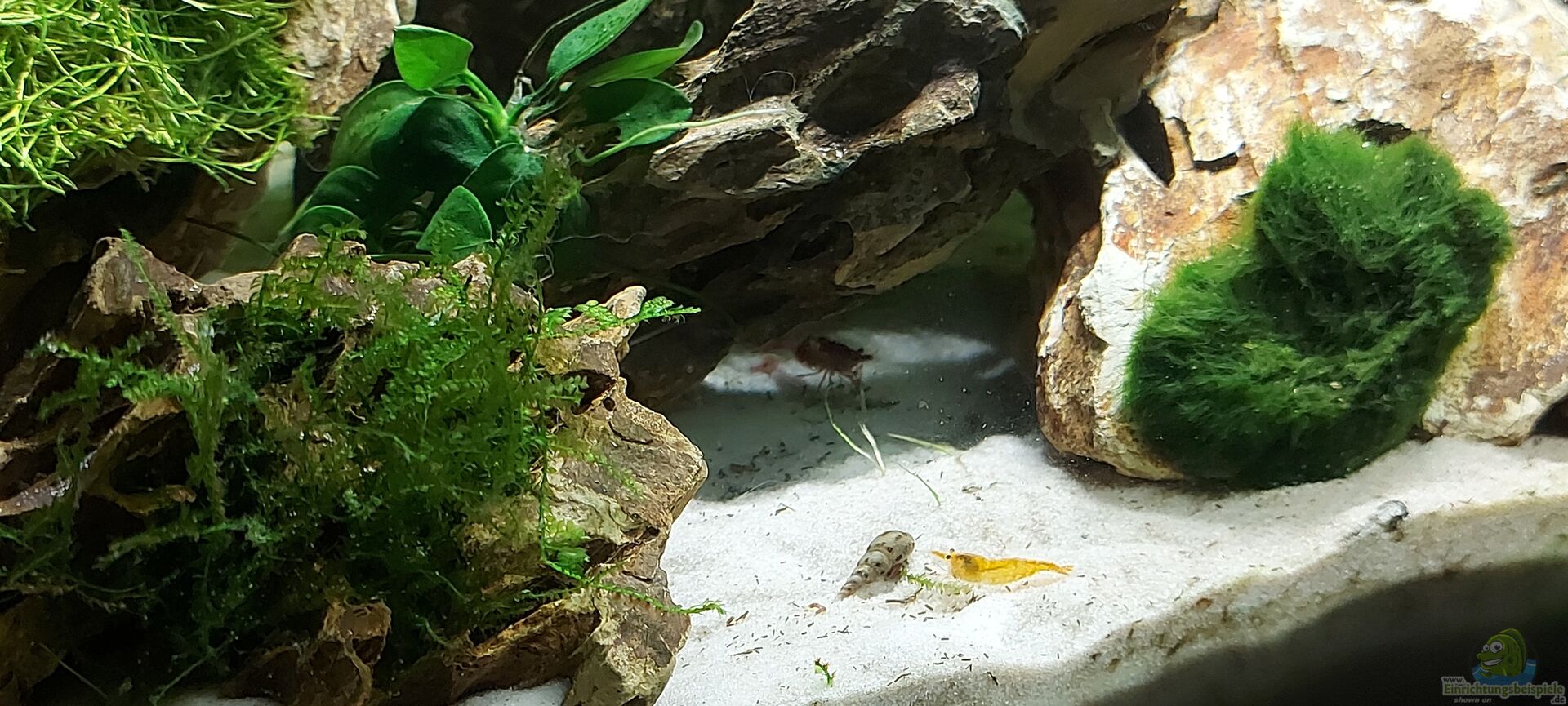 Folgende Pflanzen sind an die Drachensteine geklebt: (mit NatureHolic Sekundenkleber, unschädlich für alle Bewohner) - Anubias nana - Javafarn - Teichlebermoos - Flammenmoos