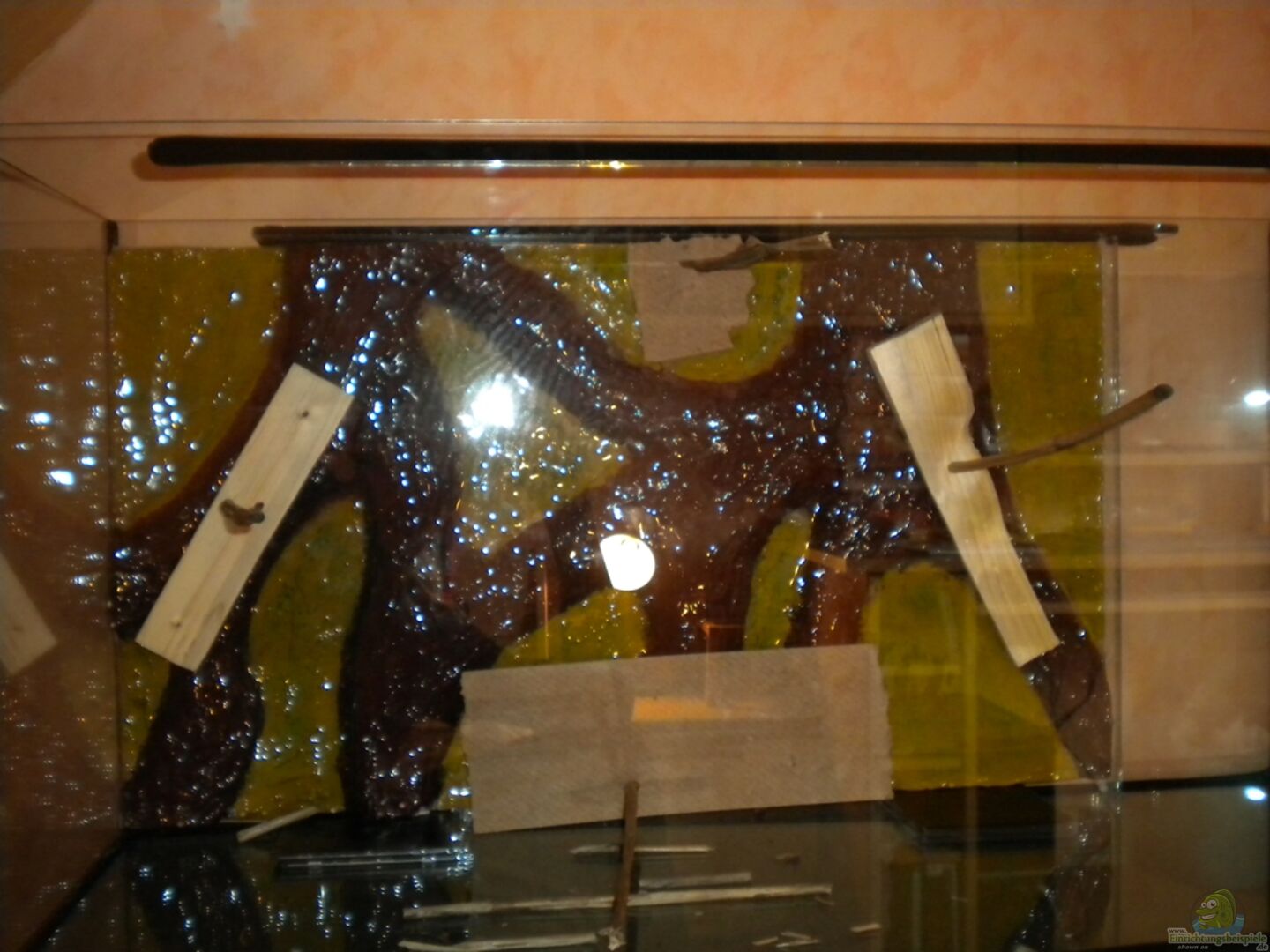 -Selbstgebaute Ruckwand: Als erstes habe ich alles aus Styropor ausgeschnitten und dann mit Gips verkleistert. Danach hab ich sie mit normaler Wandfarbe angemalt und mit 4 Lagen Epoxidharz versiegelt. Zum Schluss wurde sie mit Aquariensilikon eingeklebt. -Hamburger Mattenfilter Als erstes habe ich die beiden langen Glasstreifen eingeklebt und zum Schluss noch unten auf dem Boden fünf kleine Stückchen eingeklebt, damit kein Sand in den Filter läuft wenn man die Matte rausnimmt.
