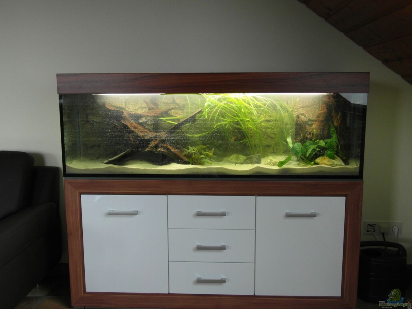 - Glasstärke 10 mm Floatglas mit schwarzem Silikon sto??verklebt - 1 Längssteg (Rückwand), der 2. (Frontseite) wurde nachträglich von mir zum besseren ???Händling??? bzw. Reinigung des Beckens entfernt. - ma??angefertigte Aquarienabdeckung passend in nussbaumfarben mit einer klassischen Baumarkt-Feuchtraumleuchte mit 2x36 Watt - Rückwandmodule von Juwel (Modell Root und Rock) - 5cm hohe aufgeklebte Sichtschutzblende für den Bodenbereich - bestehende Wohnraumkommode [...]