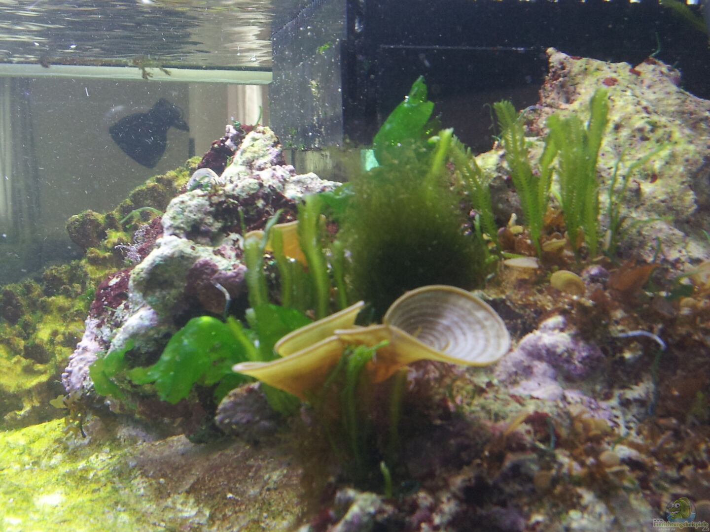 Filterbecken mit abfluss verbunden (wird umgebaut das der Abfluss zum teich geht) An der Aussenwand oben einen Abluftventilator angebracht und unten zuluftlöcher. In der Filterkammer ist Caulerpa taxifolia - Grünalge und wird wenn das Licht im Haupttank aus geht Beleuchtet (1x Aqua-Medic aquasunspot 12 W LED Spot) bis oben im Haupttank wieder das Licht angeht.