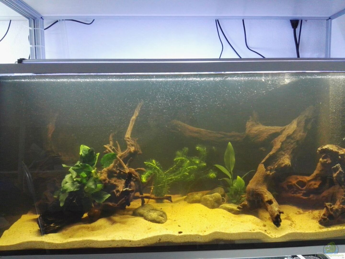 3 Scheiben des Aquariums sind mit schwarzer Farbe gestrichen. Das Becken steht in einem Regal mit insgesamt 4 Aquarien mit je 300 Litern Volumen. Das Aquarium wurde von der Firma Aquarienkontor gebaut.