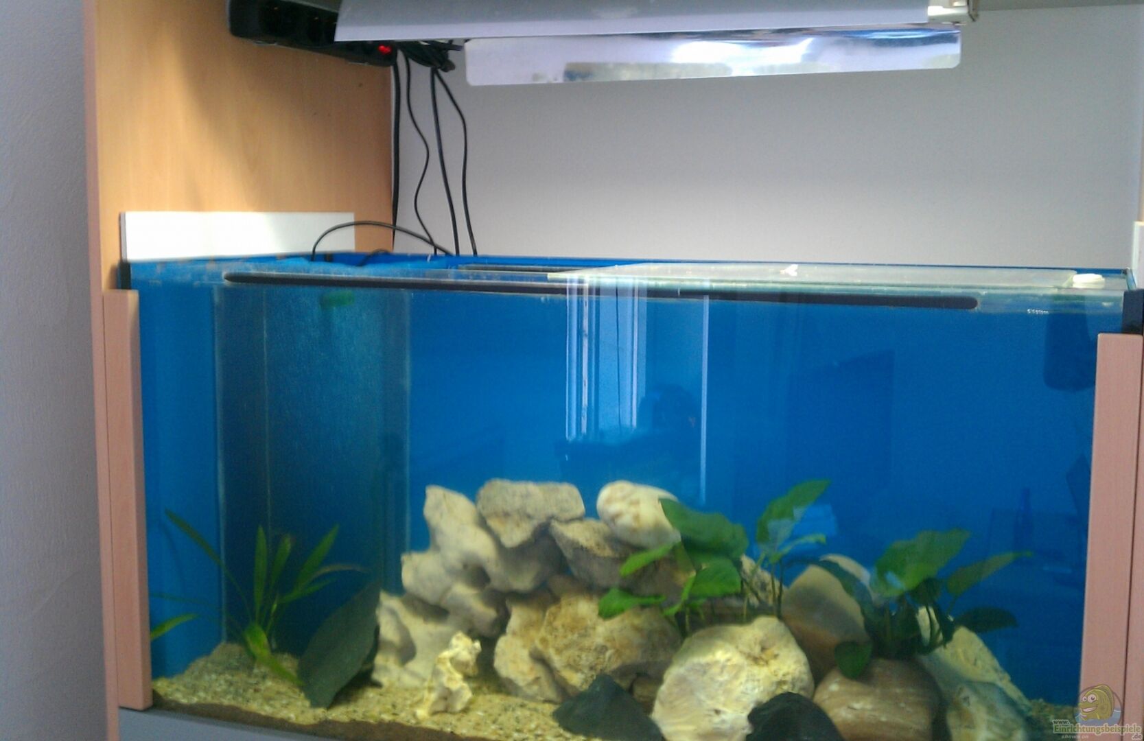 Becken ist Teil eines Aquarienschrankes (Sonderanfertigung), das aus einem 200 l Becken (oben) und einem 220 l Becken (unten) besteht. Die Blenden über den Becken sind magnetisch, die Rück- sowie Seitenwände beider Becken sind mit blauer Farbe bestrichen.