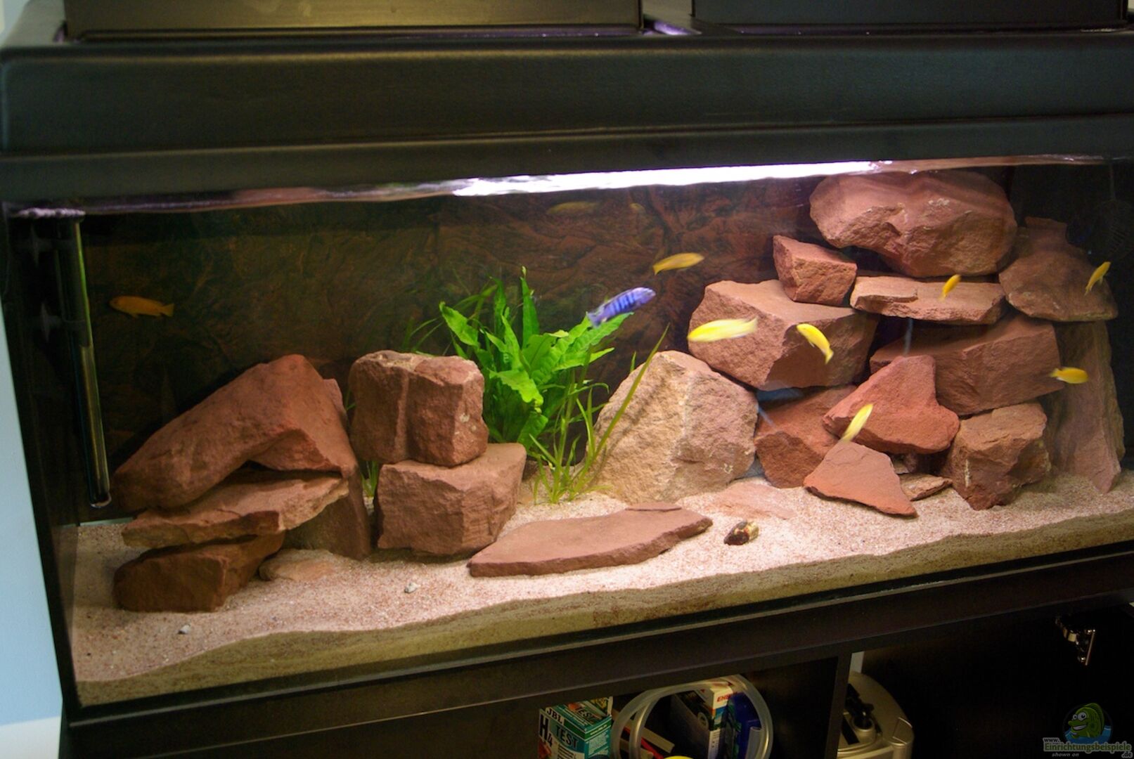 ca. 60 kg Roter Sandstein. als Unterlage dient eine 20mm Styrodurplatte. Rechts bis unter die Wasseroberfläche und mit einer Plexischeibe an der Rückwand gesichert. Die Steine reichen von der Rückwand bis ca. 5 cm vor die Frontscheibe und bilden viele Höhlen und Durchgänge, in der hinteren Ecke befindet sich der JBL Topclean Skimmer. Dieser Steinhaufen ist das Revier meines Saulosibocks, ausserdem befinden sich im hinteren Bereich auch kleinere Höhlen als Versteckmöglichkeit für [...]