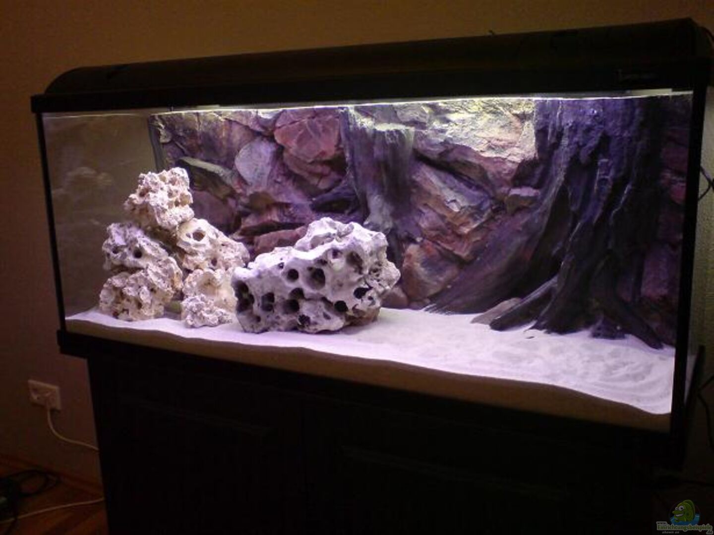 - ca. 30 Kg Lochgestein und Wurzelholz - Hintergrundwand in Felz- und Wurzelholzoptik Das Lochgestein wurde mit Aquasilikon aneinander ´geklebt´, damit sie bei einer flei??igen ´Grabaktion´ der Barsche nicht irgenswann einkrachen.