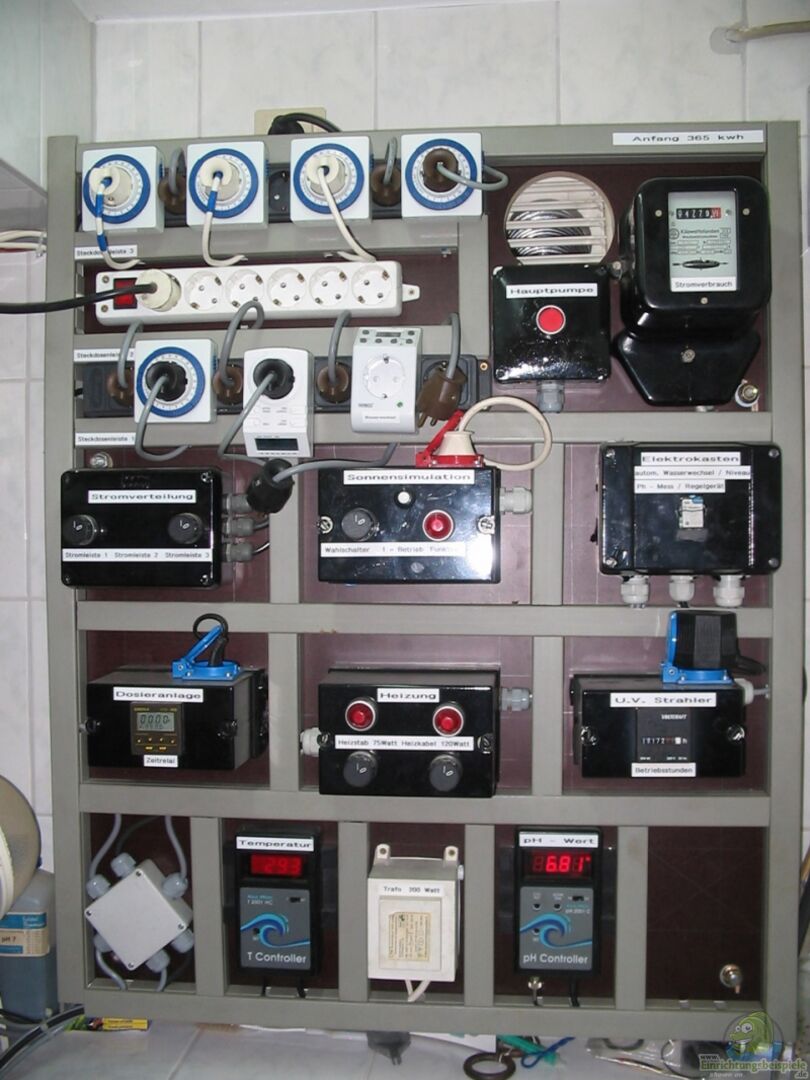 PH Mess- und Regelgerät von Aquamedic mit Eigenbau Co² Reaktor mit 4 l Volumen Temperatur Mess- und Regelgerät von Aquamedic ( Boden- und Stabheizung) Sonneauf- und Unterganssteuerung 3 Fach Dosierpumpe von Fischer UV- Reaktor 9 Watt Autom. Wasserwechsel über Magnetventil. ca. 25 l pro Tag Beleuchtungscomputer von Ecotronic