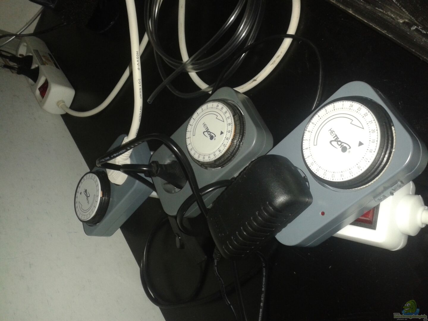 Strömungspumpe Wave Maker 2500l/Std. Luftheber damit das Wasser hinter der Rückwand stetig zurück ins Becken gepumpt wird. Heizstab von Juwel mit 200 Watt Schego Luftpumpe angeschlossen an den Luftheber LED Mondlicht 2x30 cm löst das Tageslicht ab