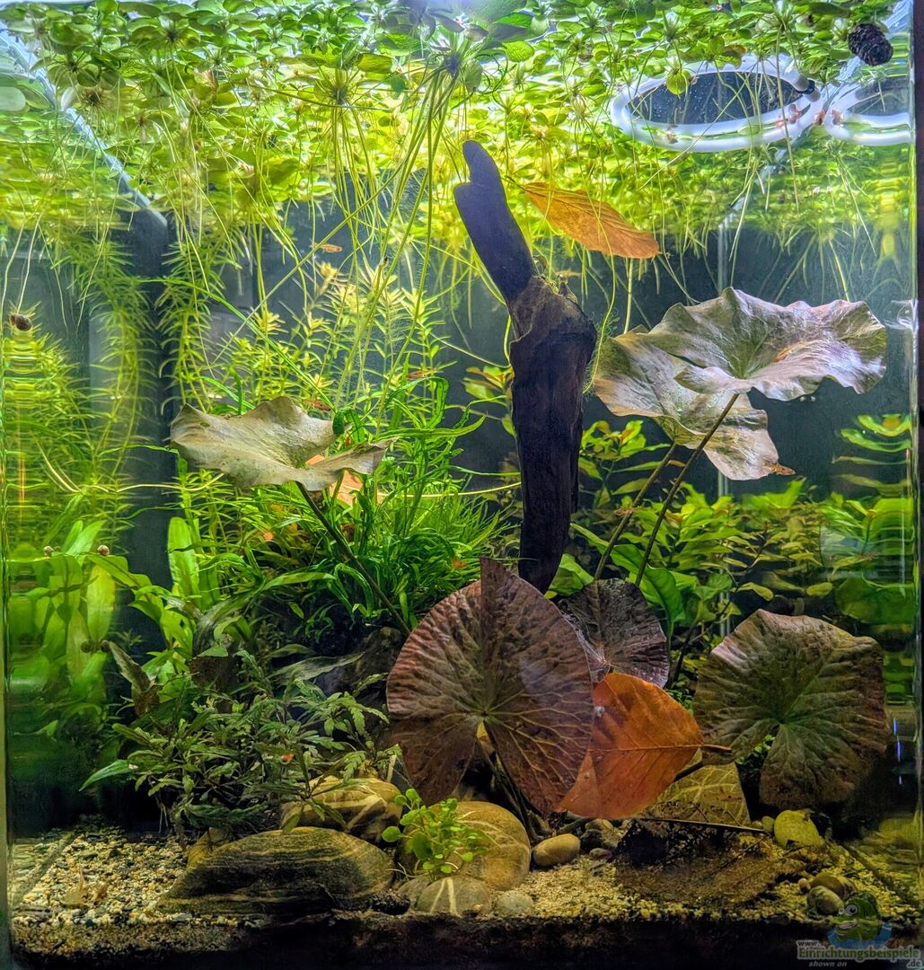 Hintergrund: Rotala rotundifolia Ludwigia repens "Rubin" Ludwigia palustris "Super Red" Mitte: Nymphea Lotus Lobelia cardinalis "Mini" Cryptocoryne undulata "Broad Leaf" Cryptocoryne nurii var. raubensis "Rosen Maiden" Aufsitzer: Anubias barteri var. coffeifolia Bucephalandra sp. "Kedagang" Bucephalandra micrantha "Needle Leaf" Microsorum trident Taxiphyllum barbieri "Java" Schwimmpflanze: Limnobium [...]