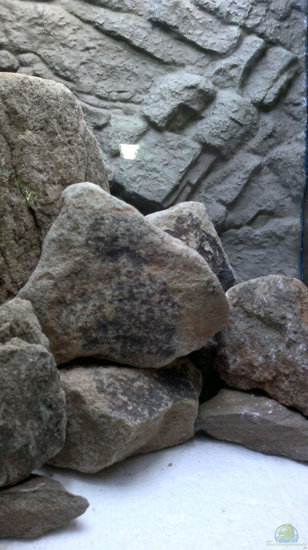 3 D Strukturrückwand Juwel Stone Lime (auf die Ma??e des Beckens zugesägt) und von innen an die Rückscheibe geklebt. Moorkienholz kleine Sandsteinbrocken