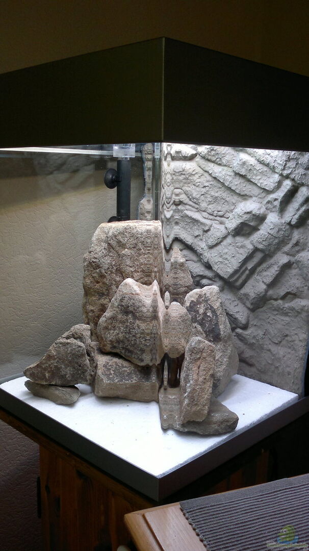 3 D Strukturrückwand Juwel Stone Lime (auf die Ma??e des Beckens zugesägt) und von innen an die Rückscheibe geklebt. Moorkienholz kleine Sandsteinbrocken