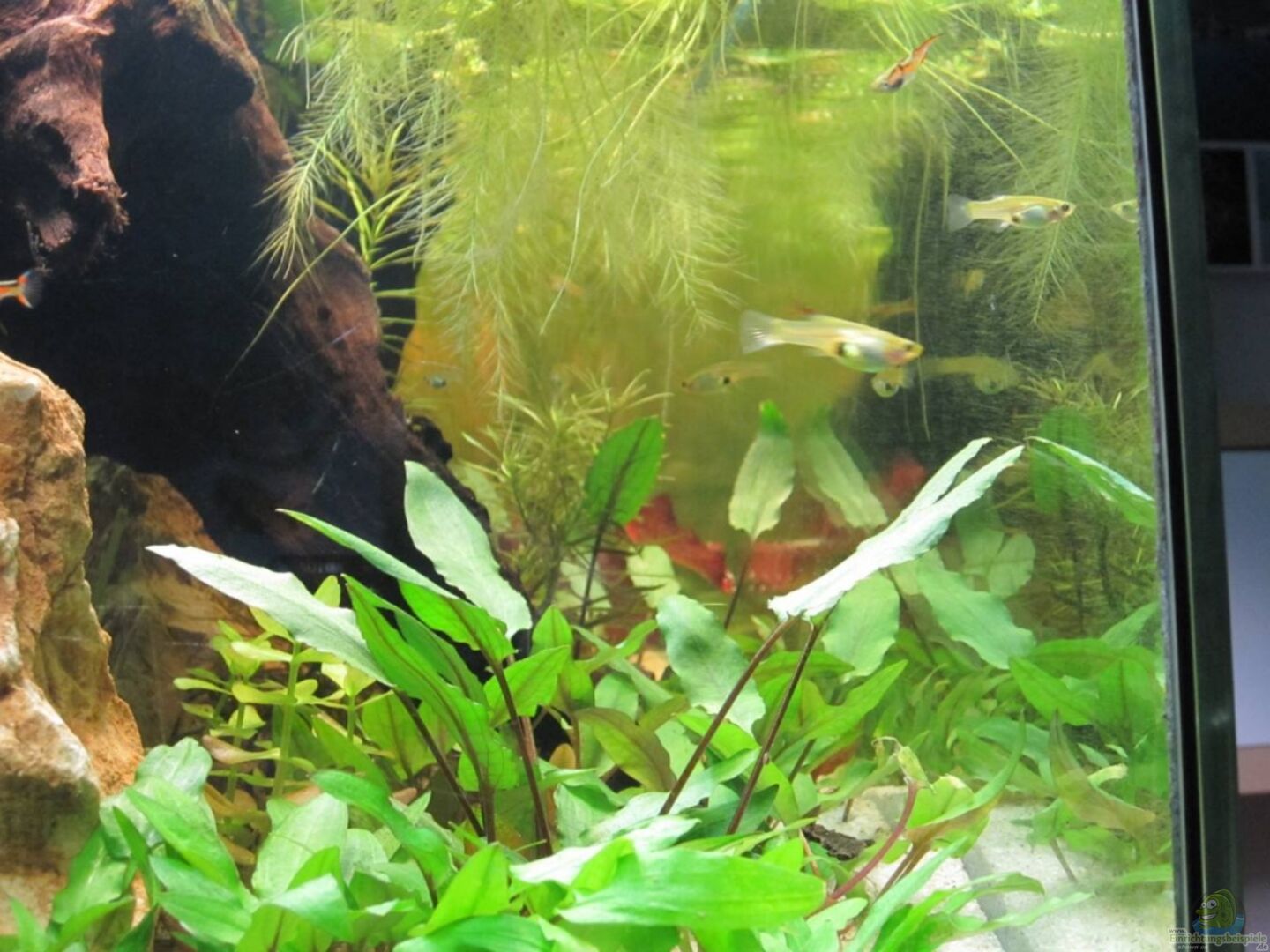 *Neolamprologus multifasciatus (gestreifter Schneckenbuntbarsch) (1/1) + Nachwuchs *Poecilia wingei (Endler Guppy) (4/10) + Nachwuchs Und die Putzkolonne: *4 Ancistrus sp. *5 Amanogarnelen (die Variante, die sich in Sü??wasser vermehrt) *x Turmdeckelschnecken, Posthornschnecken, Blasenschnecken