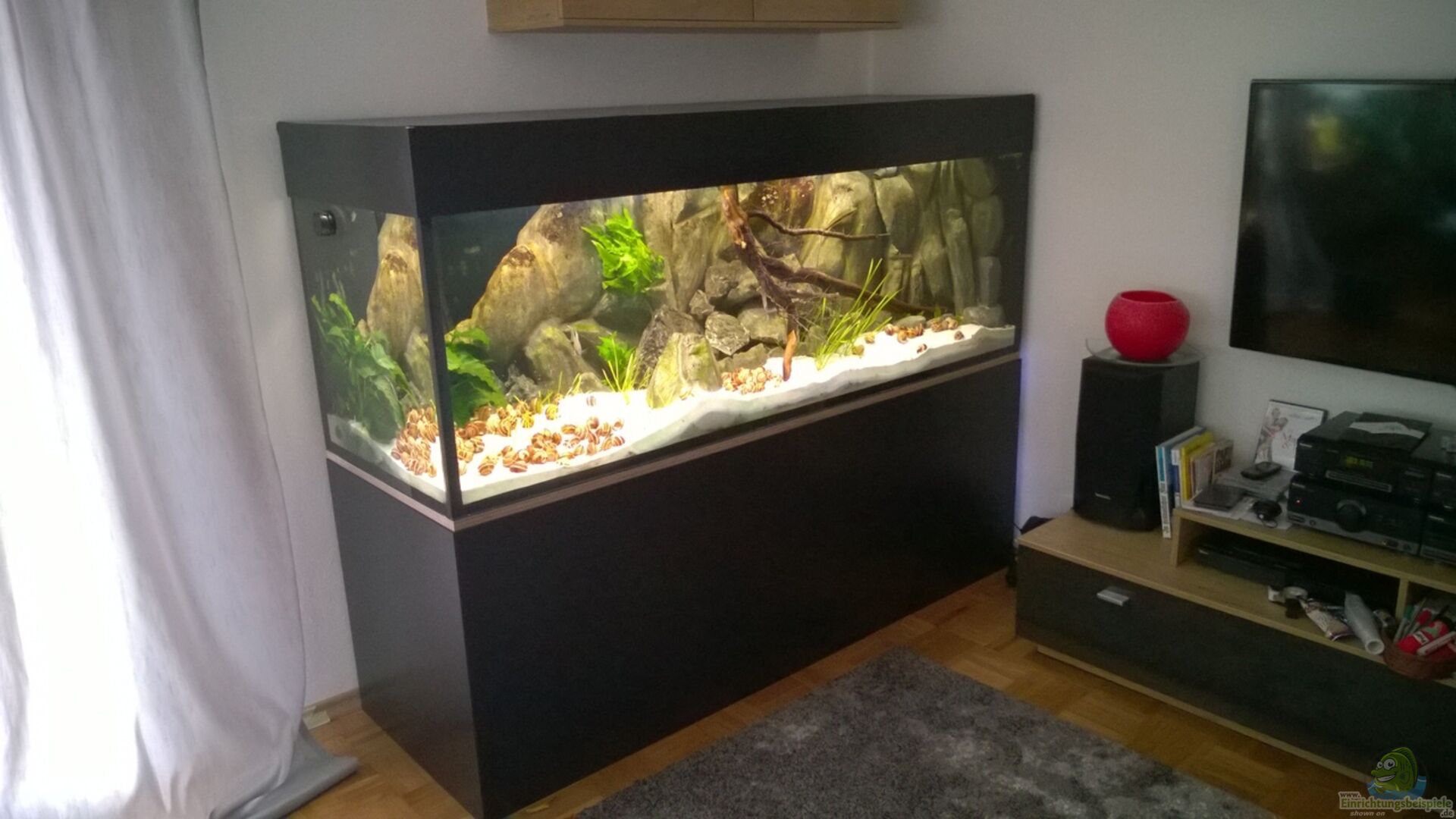 Hinten rechts doppelwandiger ??berlaufschacht mit einstellbarem Kamm für oben und 4 Gitter weiter unten für den Wasseraustausch im Bodenbereich. Bohrungen im Aqua-Boden für Ablauf nach unten und Einlauf zur Wasserrückführung. Aquarium Sto??- und Wulsverklebt. Frontscheibe aus Floatglas. Alle Scheiben sind 12mm dick.