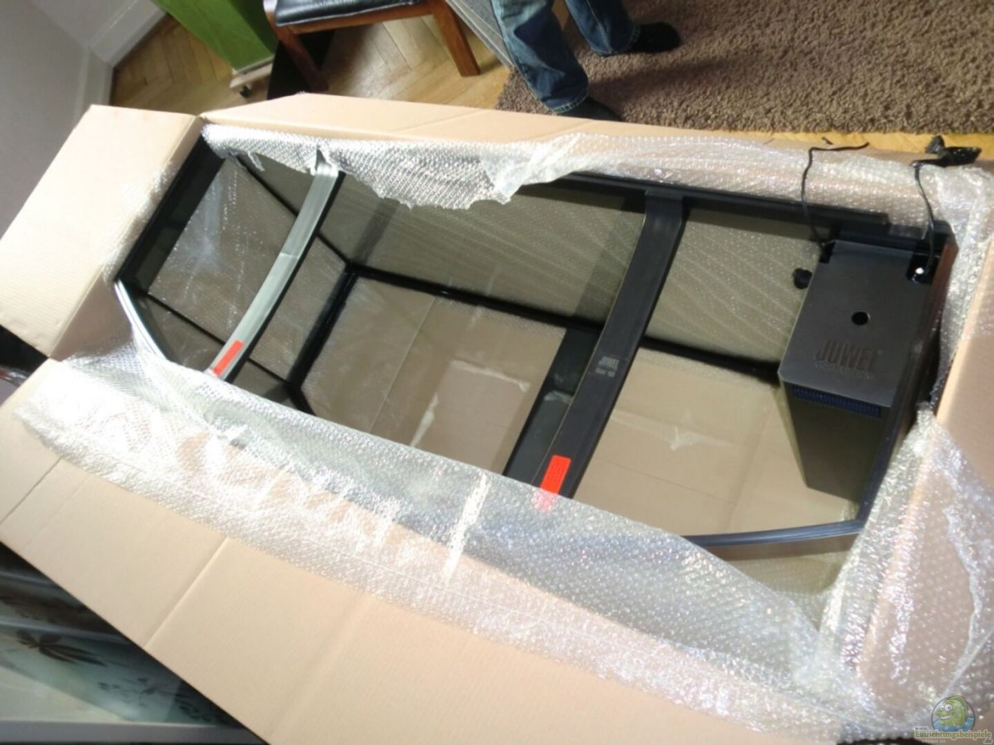 Aquarienkombination Juwel Vision 450 in dunkelbraun eingeklebte Rückwand von Back to nature, Typ Slim line, Farbe Heller Sandstein, Elemente von links nach rechts 60A, 60B und 60A, den rechten zurechtgeschnitten und den übrigen Rest von vorn an den Innenfilter geklebt. Das verwendete Silikon ist von JBL, damit also speziell für Aquarien. Der Innenfilter sollte ursprünglich raus, da er meiner Meinung nach zuviel Platz wegnimmt. Allerdings ist nach meinen letzten Infos der Abstand zwischen [...]