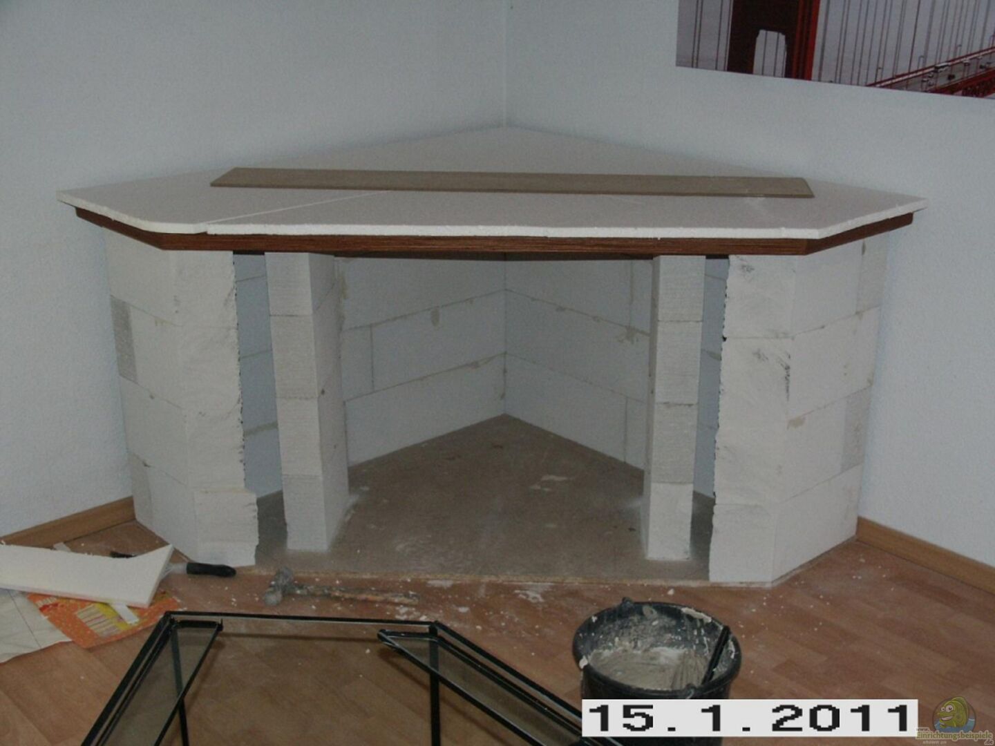 Deltabecken von Strecker Ohne Abdeck-Kasten. Die Scheiben sind Sto??- und mit einer Sicherheitsnaht verklebt, Streben oben an jeder Scheibe und mit zwei Querträgern versehen! 12mm Floatglas 3 Bohrungen 55 45 35 ohne Ablaufschacht Ablauf von der Oberfläche und vom Bodengrund Unterschrank mit 10cm Ytong gemauert. Unter dem Becken ist eine 40mm Multiplexplatte mit Styroauflage.