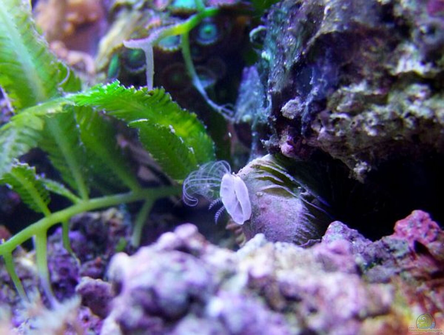 Korallen: * Zoanthus sp., unterschiedliche Färbungen. Erst nach dem zweiten Versuch klappte das Einbringen! Beim ersten mal wunderte ich mich, dass die Polypen nach und nach verschwanden... bis ich eine Heliacos-Schnecke absammelte und vor allem die dunkelgrauen Asterinas mehrfach beim gemütlichen Mampfen erwischte. Ich war mir nicht sicher, ob die kleinen Seesternchen nicht einfach nur die Gunst der Stunde nutzten und das Werk der Schnecke vollendeten- sprich, nur an bereits angeschlagenen Polypen [...]