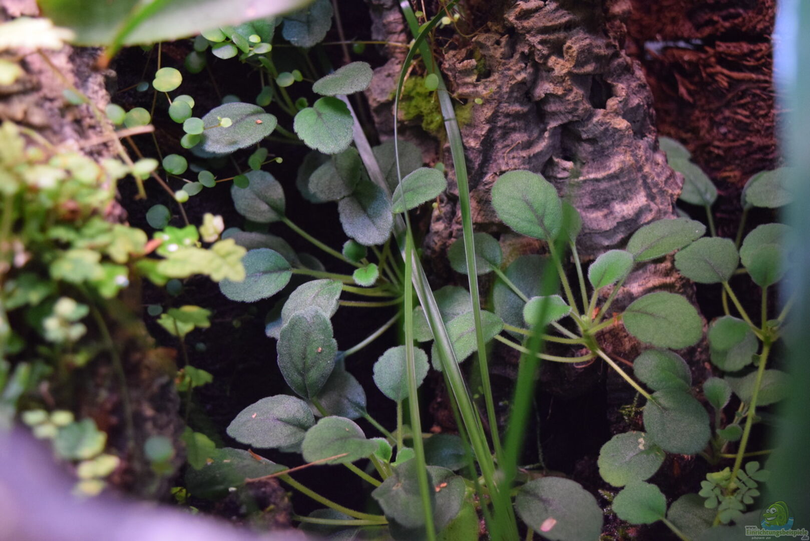 Schwimmpflanzen: Lemna minor, Limnobium laevigatum Wasserpflanzen: Ceratophyllum demersum, Echinodorus x Regine Hildebrandt, Anubias barteri Nana, Acorus gramineus Moose: Riccia fluitans, Taxiphyllum barbieri, Monosolenium tenerum Landpflanzen: Barbosella cucullata, Biophytum sensitivum, Begonia bowerae, Episcia dianthiflora, Ficus scandens, Neoregelia fireball, Neoregelia pauciflora, Neoregelia Red spottet, Peperomia, Ficus borneo, Selanginella spec, Ficus quercifolia