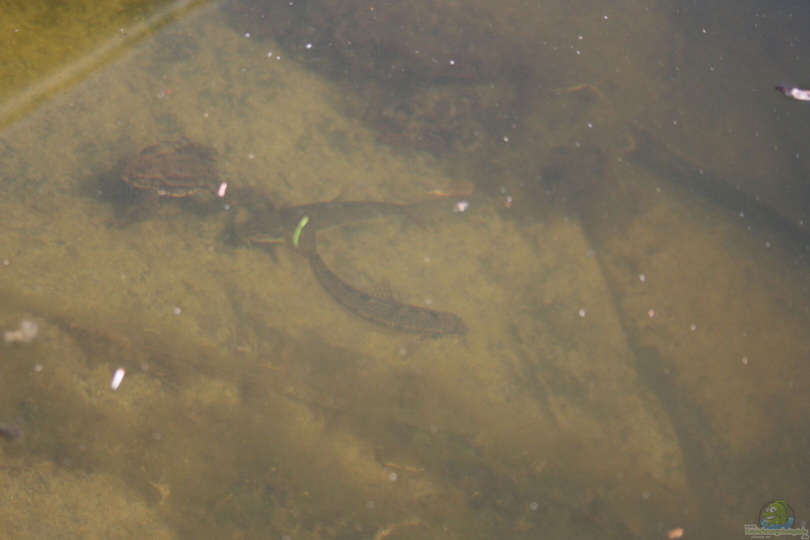 2x Gemeiner Sonnenbarsch (Lepomis gibbosus) unbekannte Anzahl Gründlinge (Gobio gobio) unbekannte Anzahl Scheibenbarsche (Enneacanthus chaetodon) 12x China-Makropode, Macropodus ocellatus, Zu Besuch: Teichfrosch, Erdkröte, Grasfrosch die alle ablaichen und sich reichlich vermehren. Verschiedene Libellenarten.