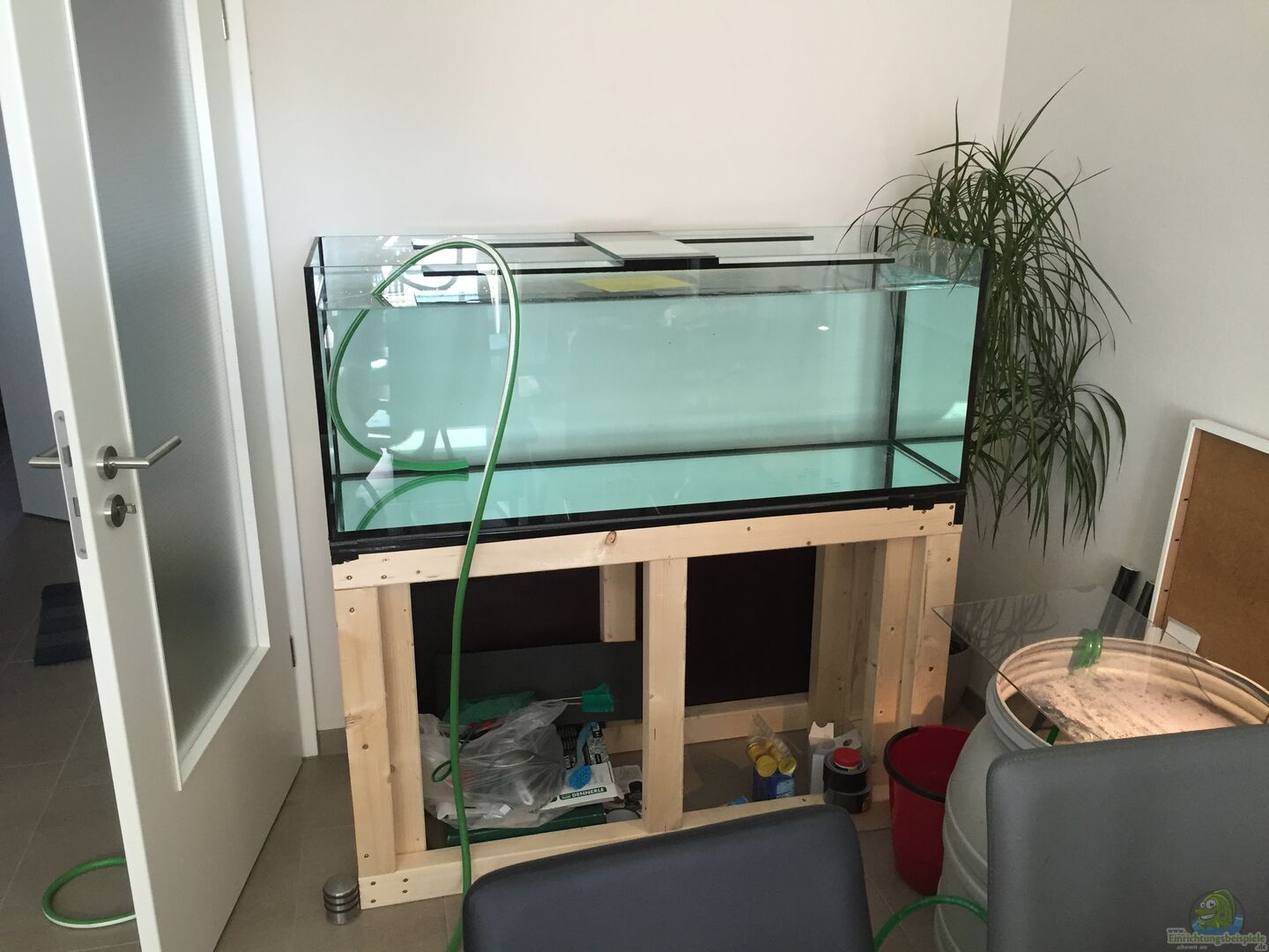 Das Aquarium habe ich bei Aquarienkontor bestellt. Es ist ein ganz normales Becken mit Sto??verklebung, ohne Bohrungen oder Wei??glas. Die Rückscheibe und die rechte Seitenscheibe habe ich von au??en mit einer schwarzen Folie aus dem Baumarkt beklebt.