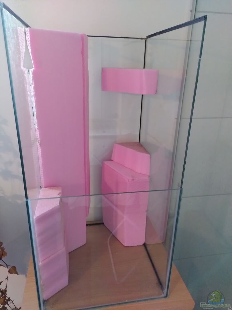 Es handelt sich um ein Standart 60cm-Becken, welches allerdings hochkant steht und vorne mit 2 30x30 cm Glasscheiben nachgerüstet wurde (unten verklebt, obere Scheibe als "Falltür"). Bei der ehemaligen Seitenscheibe, jetzt oben, wurden die Silikonnähte aufgetrennt; die Scheibe liegt jetzt lose auf.