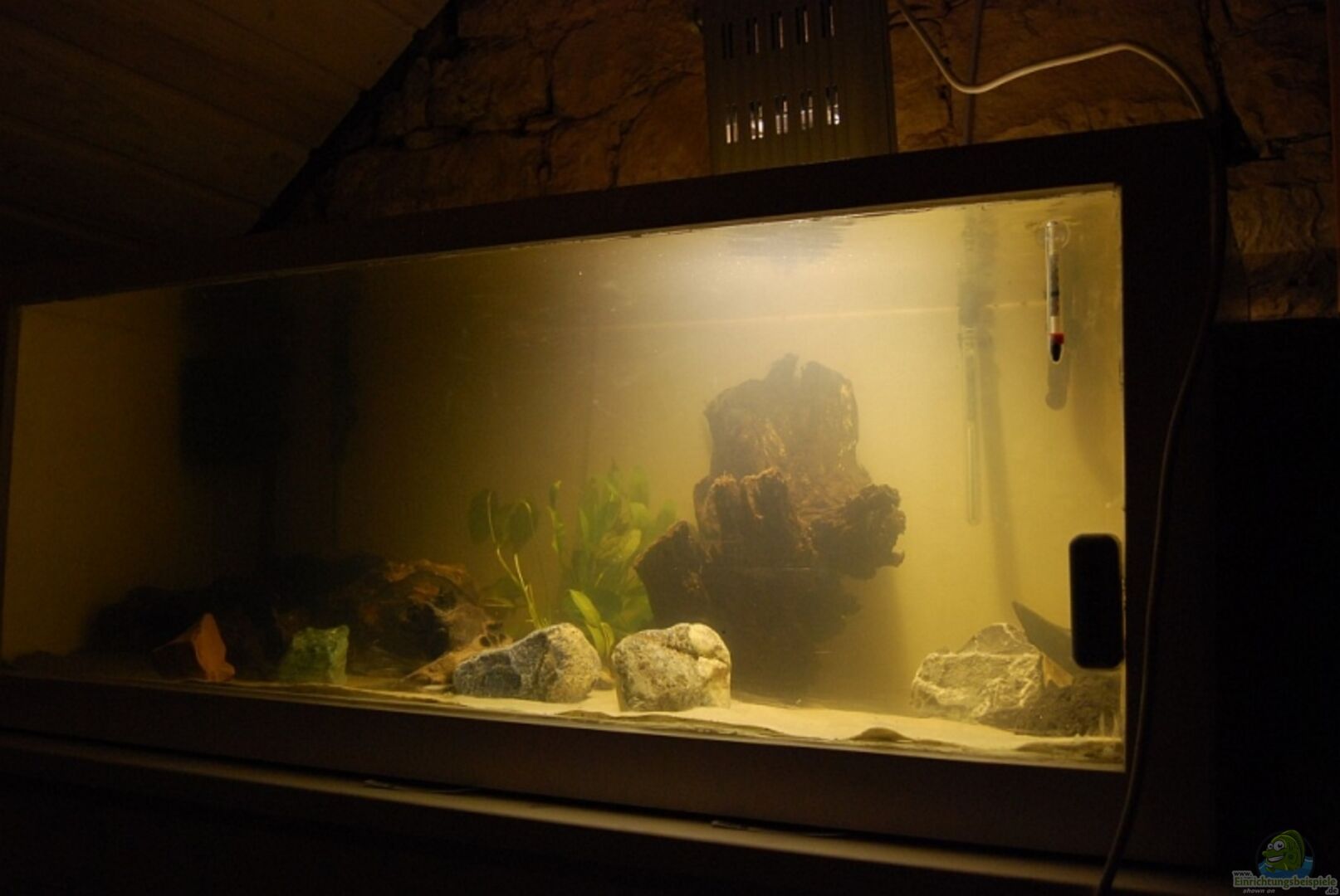 Aquarium besteht aus Holz mit GFK-Ausklebung, Aquarium noch im Aufbau An der Rückwand wurde nichts geändert. Die Glasfaserleinwand wird durch das Harz fast transparent und der Farbton vom Holz kommt durch. Dieser passt zur Sandsteinwand hinter dem Aquarium und ergänzt diese gut in das Aquarium hinein.