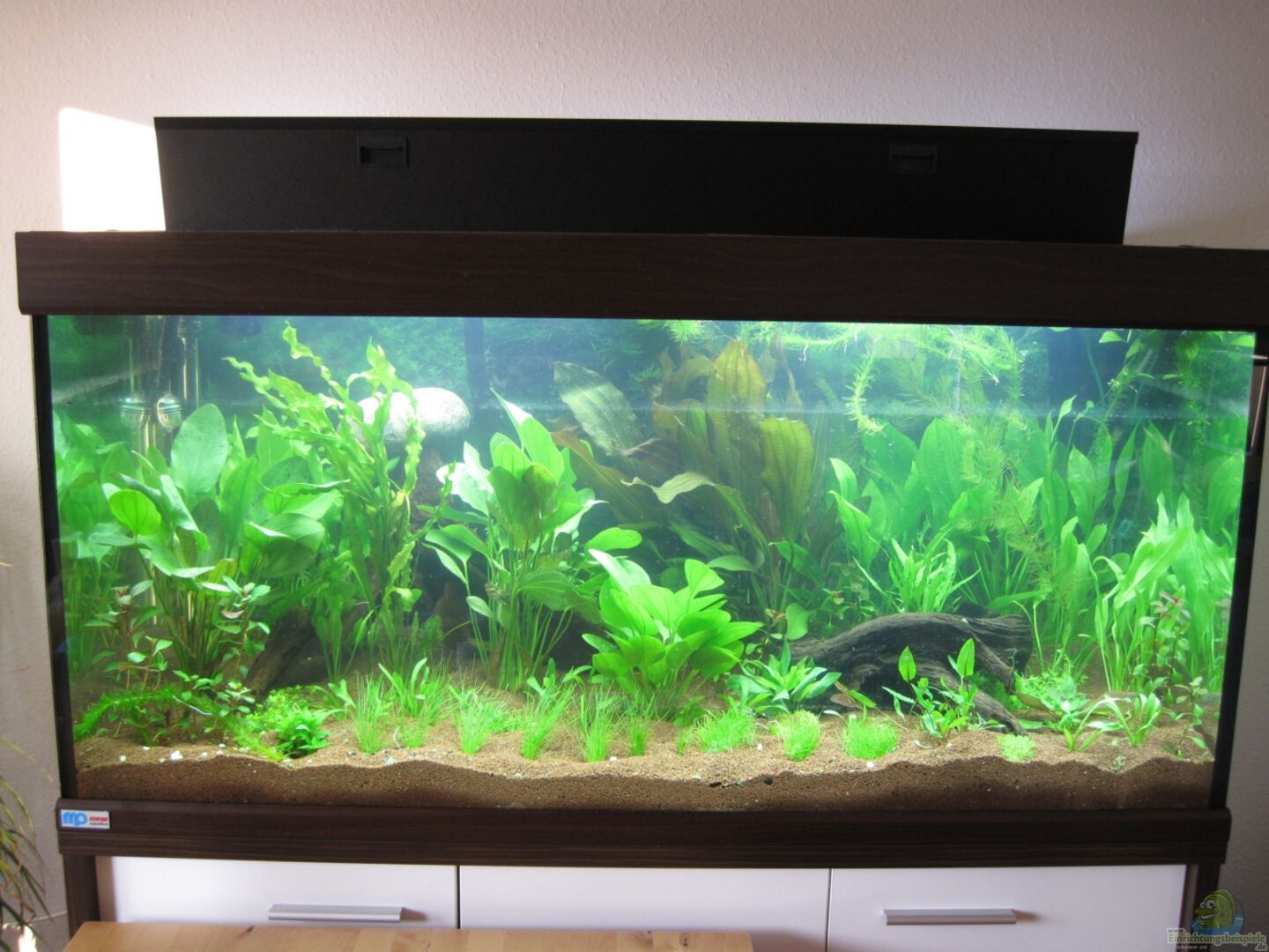 Dieses Becken soll möglichst optimal auf die Blaupunktbuntbarsche abgestimmt sein. Glücklicherweise lassen Blaupunktbuntbarsche die Pflanzen komplett in Ruhe und wühlen nicht. Ich könnte also jede beliebige Pflanzenart halten. Damit das Aqurium aber noch natürlich wirkt, habe ich mich auf 5 verschiedene Pflanzenarten beschränkt.