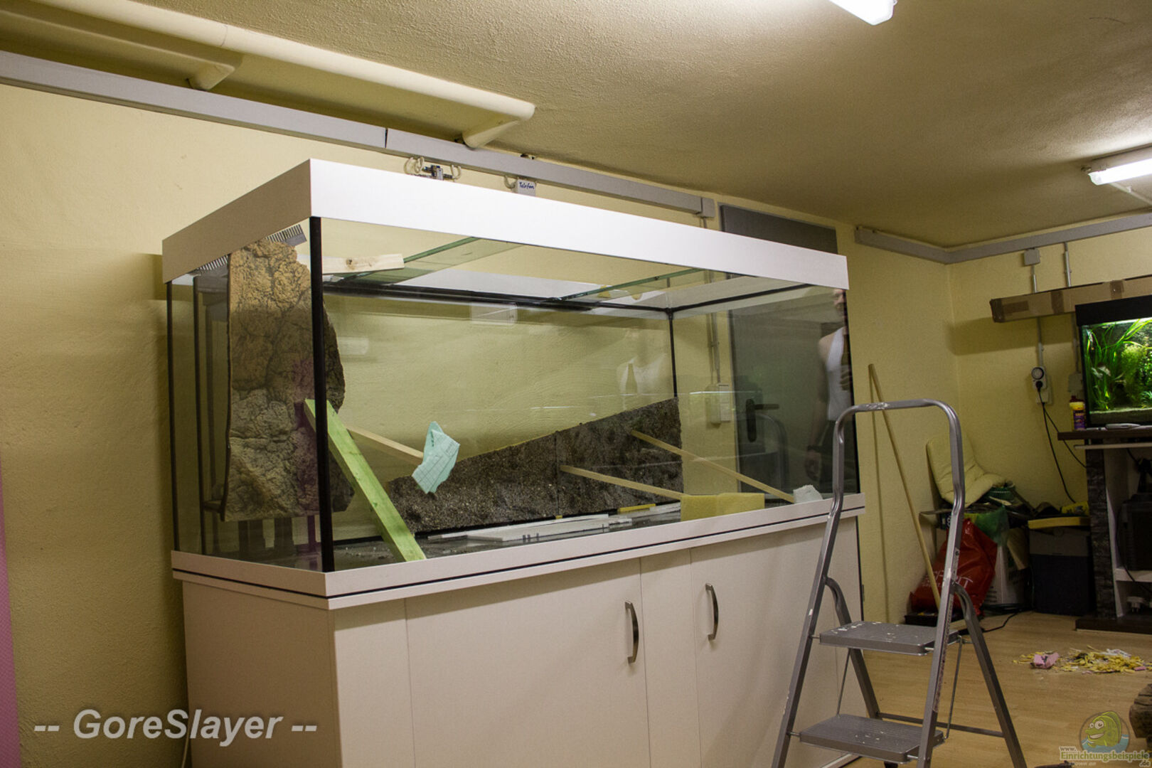 Das Aquarium ist vom Typ: Rechteck und steht im Keller auf einem ProfiLine Stahlschrank (180 x 70 x 74) mit 2 Türen, welche mit einem Softeinzug ausgestattet sind, um Erschütterungen zu vermeiden. Das Schrankdekor, die ABS-Kanten, die Kiesblende sowie die Abdeckung sind in Weiss gewählt wurden. Für die Türgriffe wurde der Typ - Dinia benutzt. Zwischen Becken und Schrank sowie Schrank und Untergrund befinden sich zwei Filz Sicherheitsauflagen. Das Becken ist aus 12mm Floatglas aufgebaut [...]