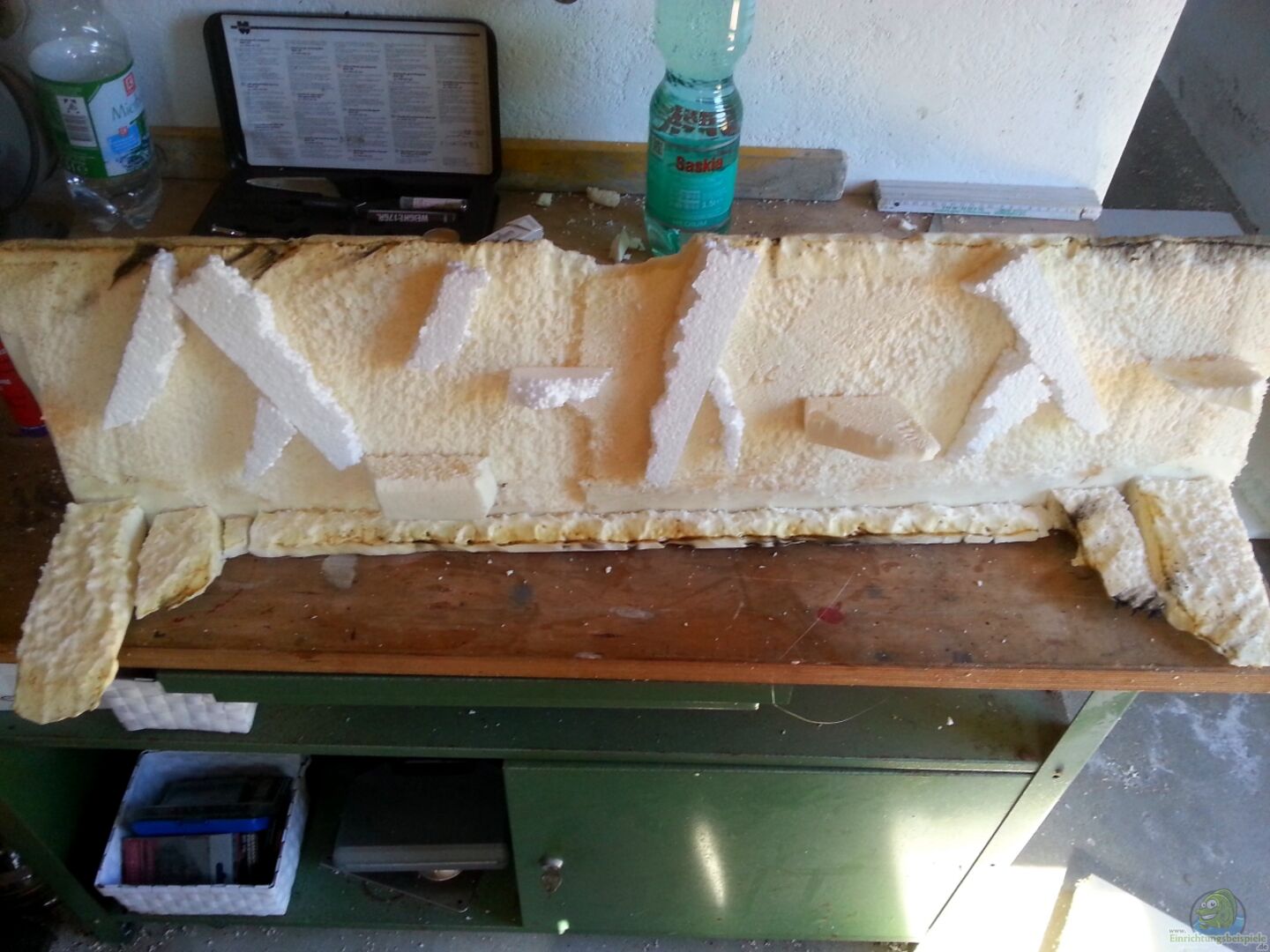 Rückwände: Im Becken ist im Submersen Teil eine geteilte Mangrovenrückwand angebracht. Im emersen Teil habe ich eine Rückwand gebaut welche ständig von oben mit Wasser überlaufen wird. Die Rückwand besteht aus Styropor und Styrodur. Anfangs habe ich eine grobe Struktur geschaffen und diese verklebt. Danach würde das ganze etwas "angesenkt" um weitere Struktur zu schaffen. Dann habe ich alles mit Gewebematten belegt um anschliessend Gewebespachtel gemischt mit Abtönfarbe [...]