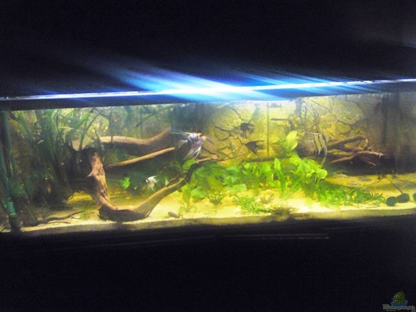 Ursprünglich sollte dies ein Südamerika-Becken sein, bis ich aus einer Beckenauflösung 5 Kongosalmler und 1 siamesische Saugschmerle aufgenommen habe. Nennen wir es also jetzt "Klassisches Gesellschaftbecken". Das Ganze steht auf einer stabilen Alu-Kostruktion, die mit beklebtem Holz verkleidet ist.
