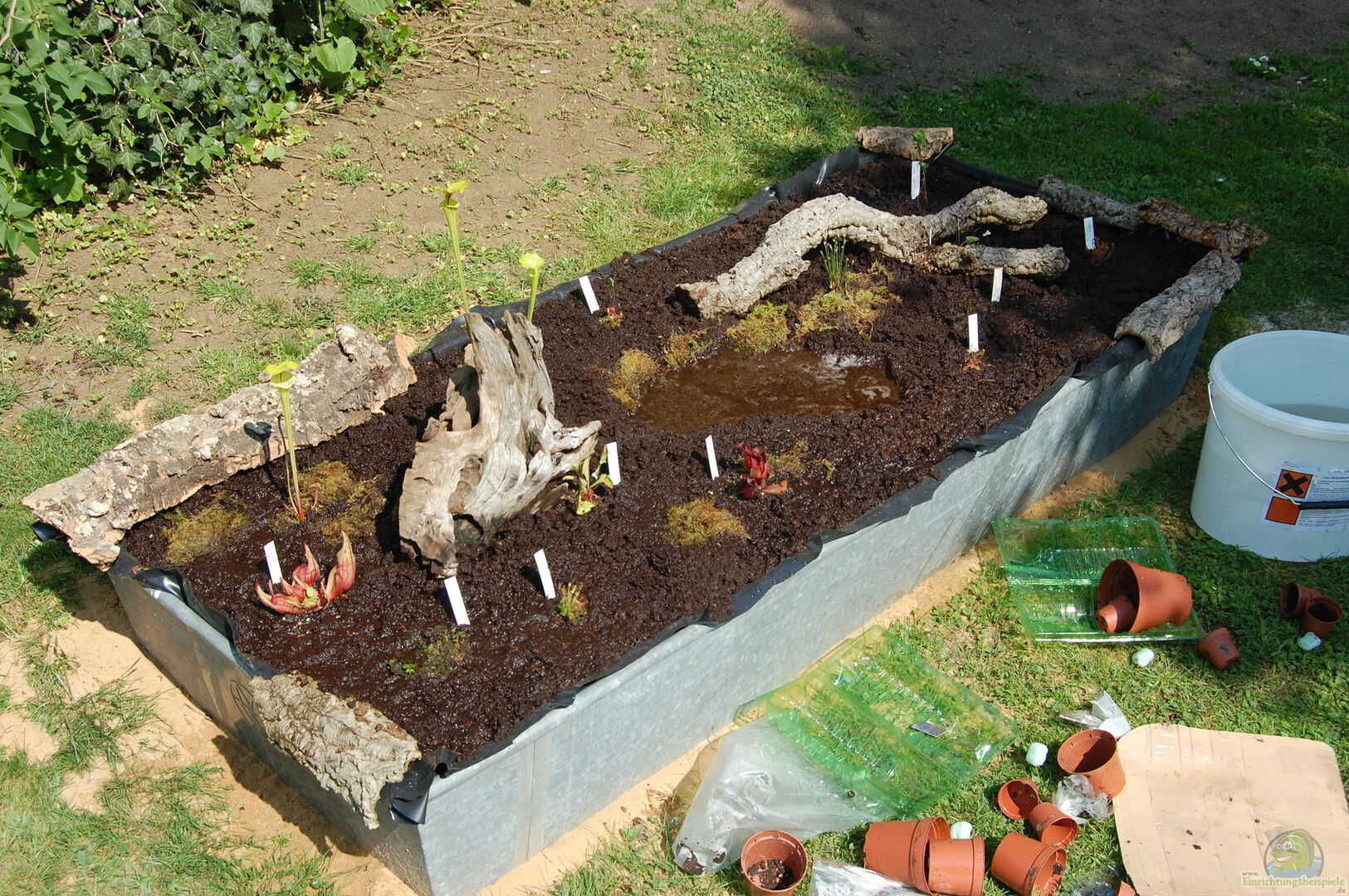 Das Moorbeet das ich hier vorstellen möchte, läuft seit 2014. Als Wasserspeicher in den heissen Sommermonaten dienen 2 umgedrehte 80cm im Durchmesser Blumenkübel aus Plastik. Ich hab diese mit mehreren grossen 1 cm grossen Löchern versehen, damit Wasser ein und austreten kann. Aufgefüllt wurde das Ganze mit wenig zersetzem Hochmoortorf, welches anschliessend mit Regenwasser aus der Tonne ca. 2 Wochen gewässert wird. Torf kann das siebenfache an Wasser aufnehmen, bis er endlich gesättigt [...]