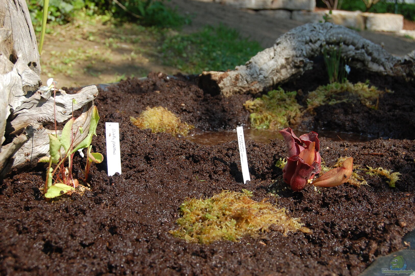 Das Moorbeet das ich hier vorstellen möchte, läuft seit 2014. Als Wasserspeicher in den heissen Sommermonaten dienen 2 umgedrehte 80cm im Durchmesser Blumenkübel aus Plastik. Ich hab diese mit mehreren grossen 1 cm grossen Löchern versehen, damit Wasser ein und austreten kann. Aufgefüllt wurde das Ganze mit wenig zersetzem Hochmoortorf, welches anschliessend mit Regenwasser aus der Tonne ca. 2 Wochen gewässert wird. Torf kann das siebenfache an Wasser aufnehmen, bis er endlich gesättigt [...]