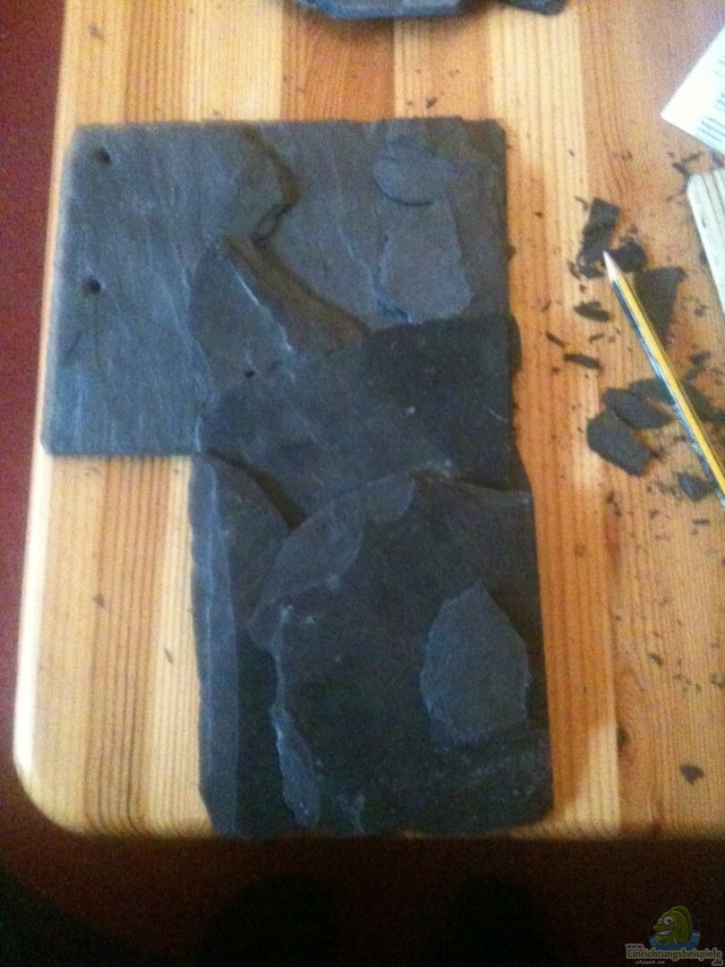 1x mangroven Wurzel im Hintergrund 3x Lavasteine in der Mitte des Beckens Naturschieverplatten an der hinteren Scheibe als Rückwand