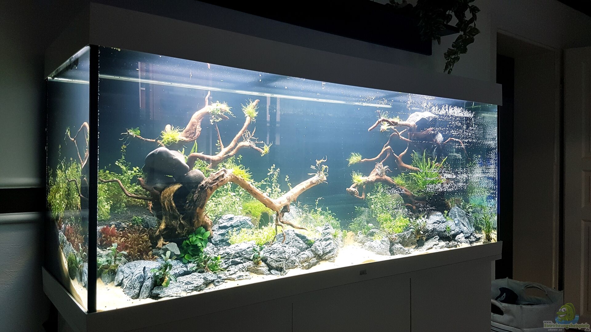 Aquarium aufgelöst, nur noch als Beispiel... Es handelt sich um ein Juwel Rio 450 Aquarium mit Multilux LED Beleuchtung. Eine 3 mm Plexiglas Platte wurde auf Aquarienboden verklebt um die punktuelle Belastung durch Spitze Steine zu verringern. Aufgerüstet um eine weitere Multilux LED Leuchteinheit.